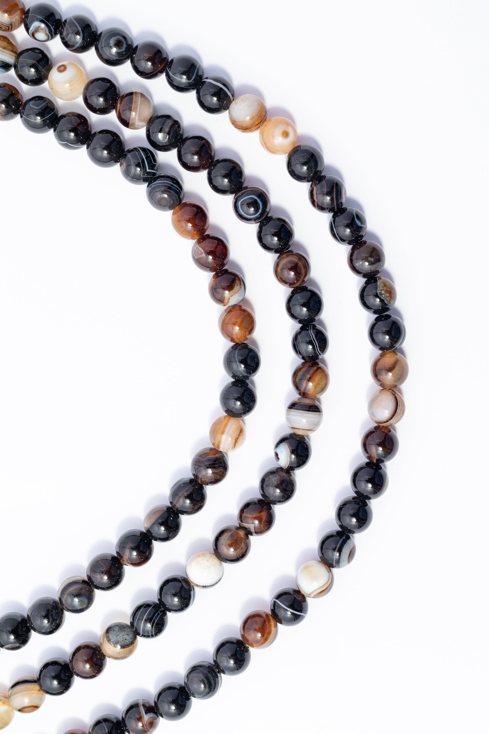 Cuentas redondas y pulidas de Ágata con alto brillo. Su diseño de bandas combina el negro sólido con tonos blanco hueso, marrón cÁlido y gris.