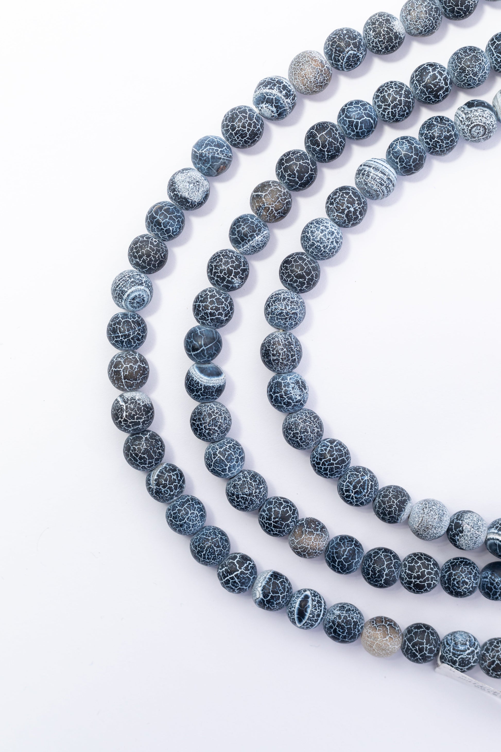 Cuentas redondas y brillantes de Ágata con patrón de craquelado (grietas). Tonos de azul/gris oscuro con líneas negras.