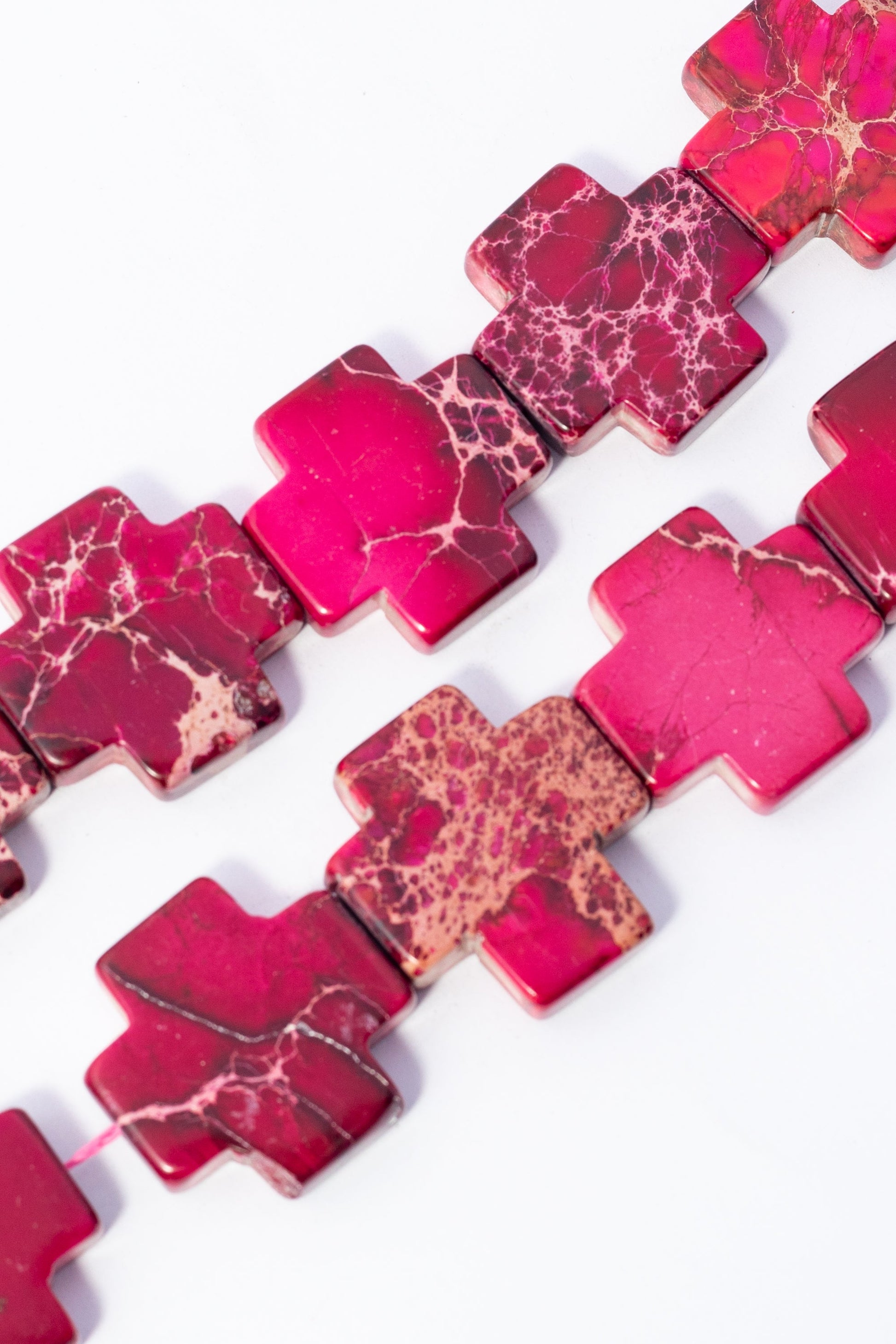 | 25mm | 003382 | 417.6 | Cuentas de Ágata natural con forma de cruz plana (briollette) y un acabado liso y pulido. Tonalidades de rojo rubí intenso a fucsia, con vetas blancas y negras que crean un llamativo patrón craquelado. Ideales para joyería statement de acento o collares que busquen una forma simbólica y moderna con un color potente. |
