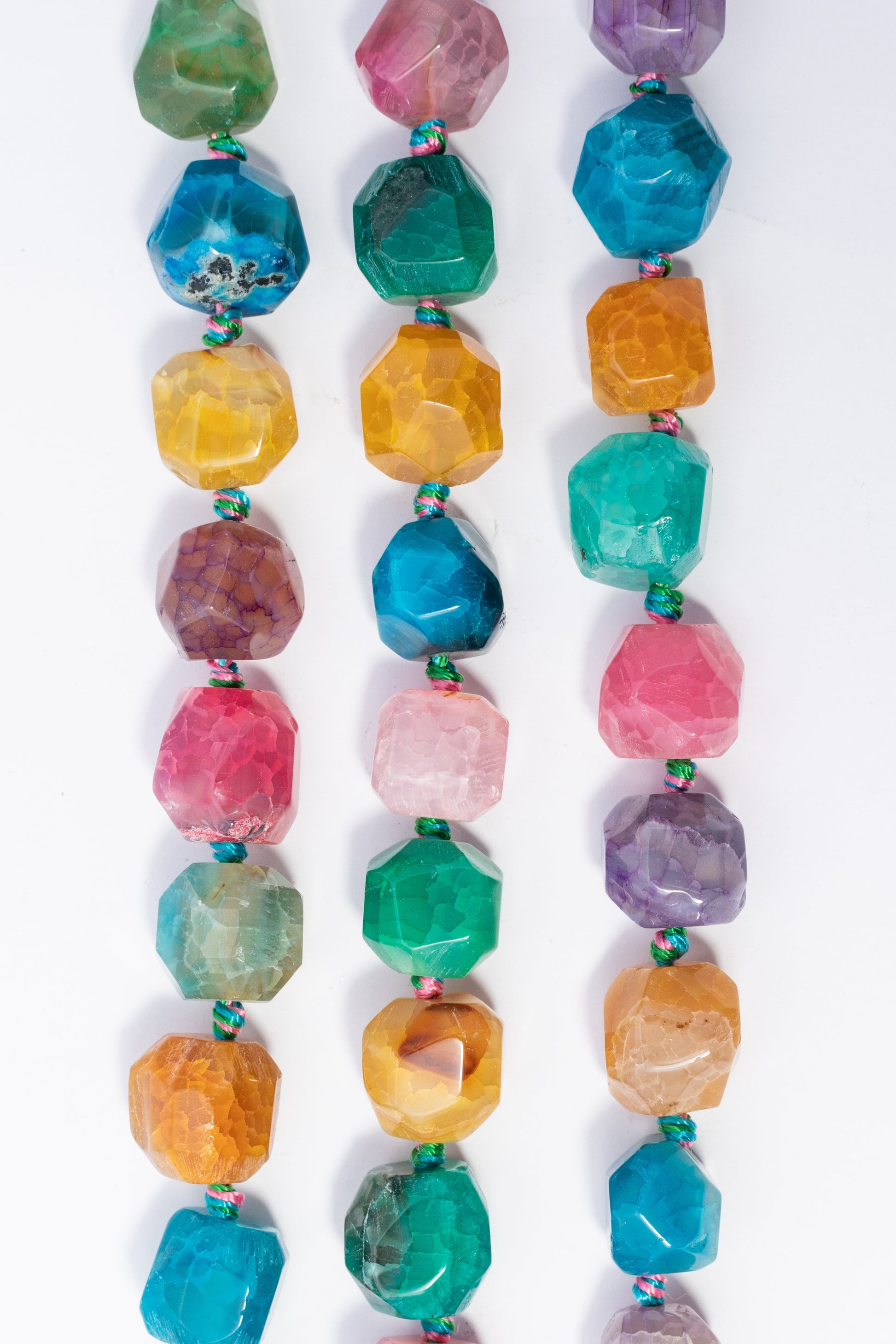 | 15mm | 002674 | 672 | Cuentas de Ágata grande, con forma de nugget facetado irregular que maximiza el brillo. Mezcla vibrante de colores (turquesa, fucsia, amarillo, morado, verde) en cada hebra. Ideales para collares statement llamativos o piezas centrales de pulseras que busquen un diseño moderno, r̼stico y audaz. |