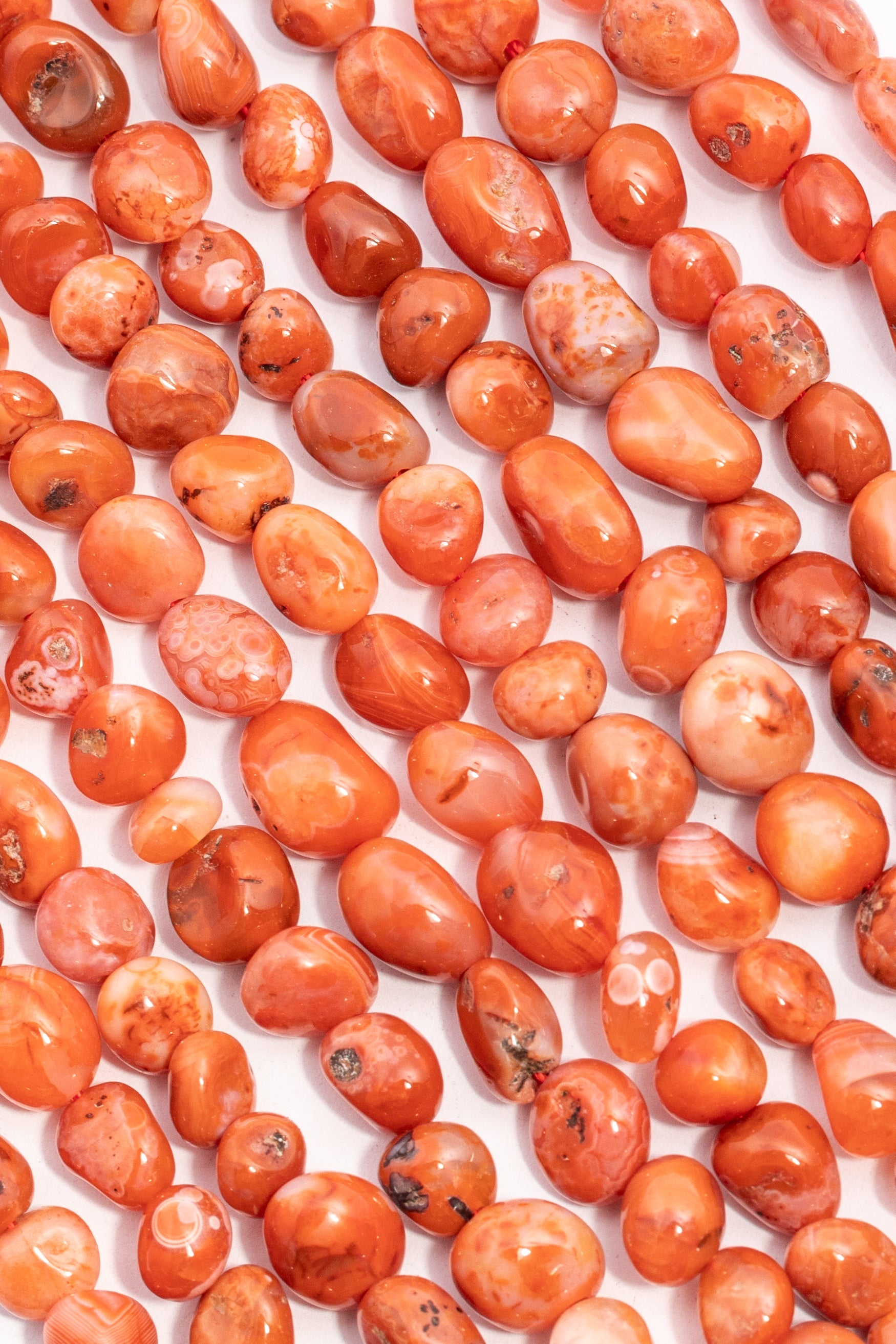 | 6mm-8mm | 005019 | 588 | Cuentas de Ágata natural con forma de óvalo irregular (nugget) y un acabado liso y pulido sin facetas. Color naranja intenso a coral, con vetas blancas y marrones que imitan la textura del coral natural. Ideales para joyería r̼stica, étnica o veraniega, como collares largos o pulseras de acento, que buscan una forma orgÁnica y un color vibrante. |