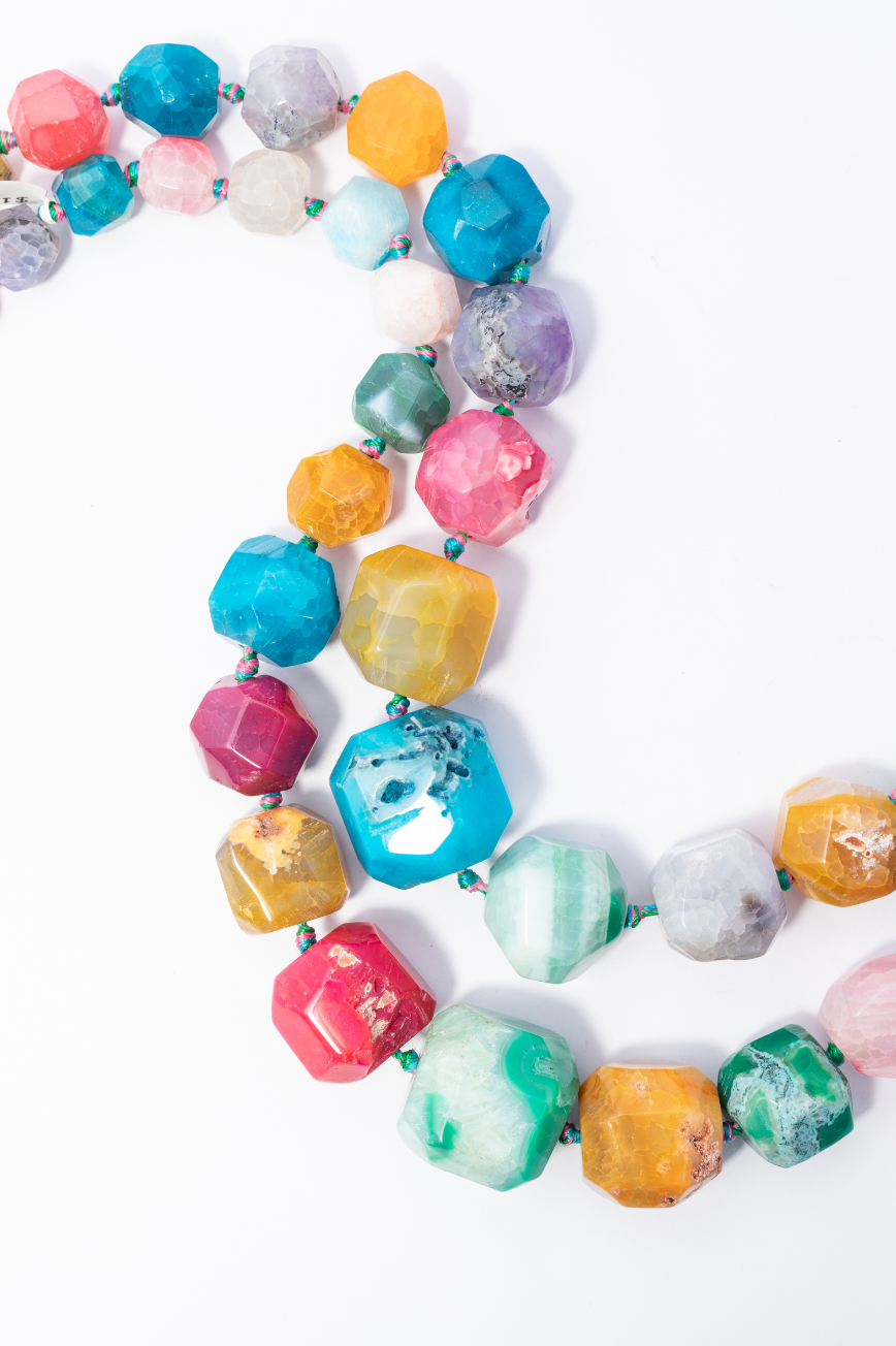 | 12mm-24mm | 001682 | 1022.4 | Cuentas de Ágata grande, con forma facetada irregular. Mezcla vibrante de colores. Ideales para collares statement que busquen un efecto dramÁtico y audaz. |