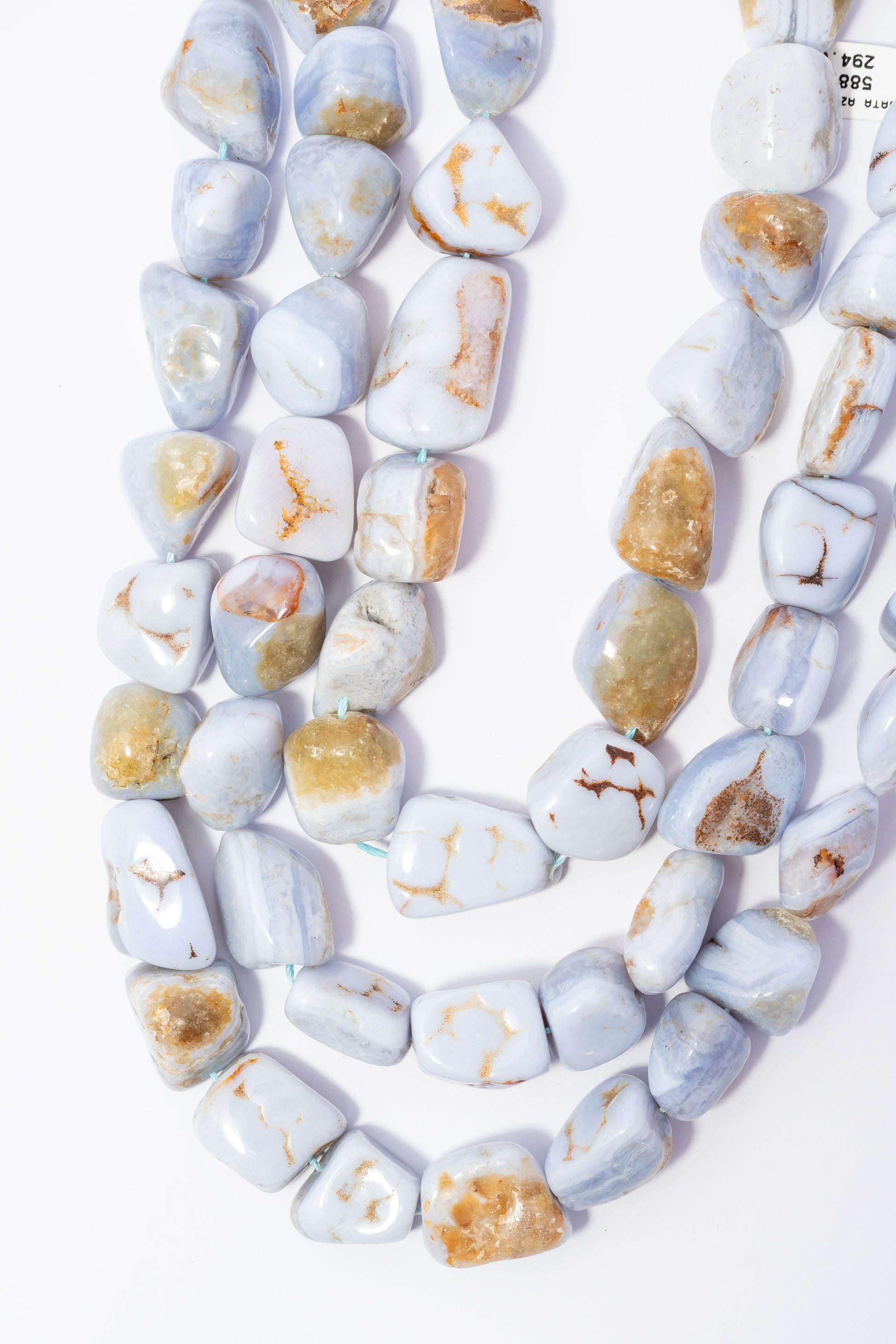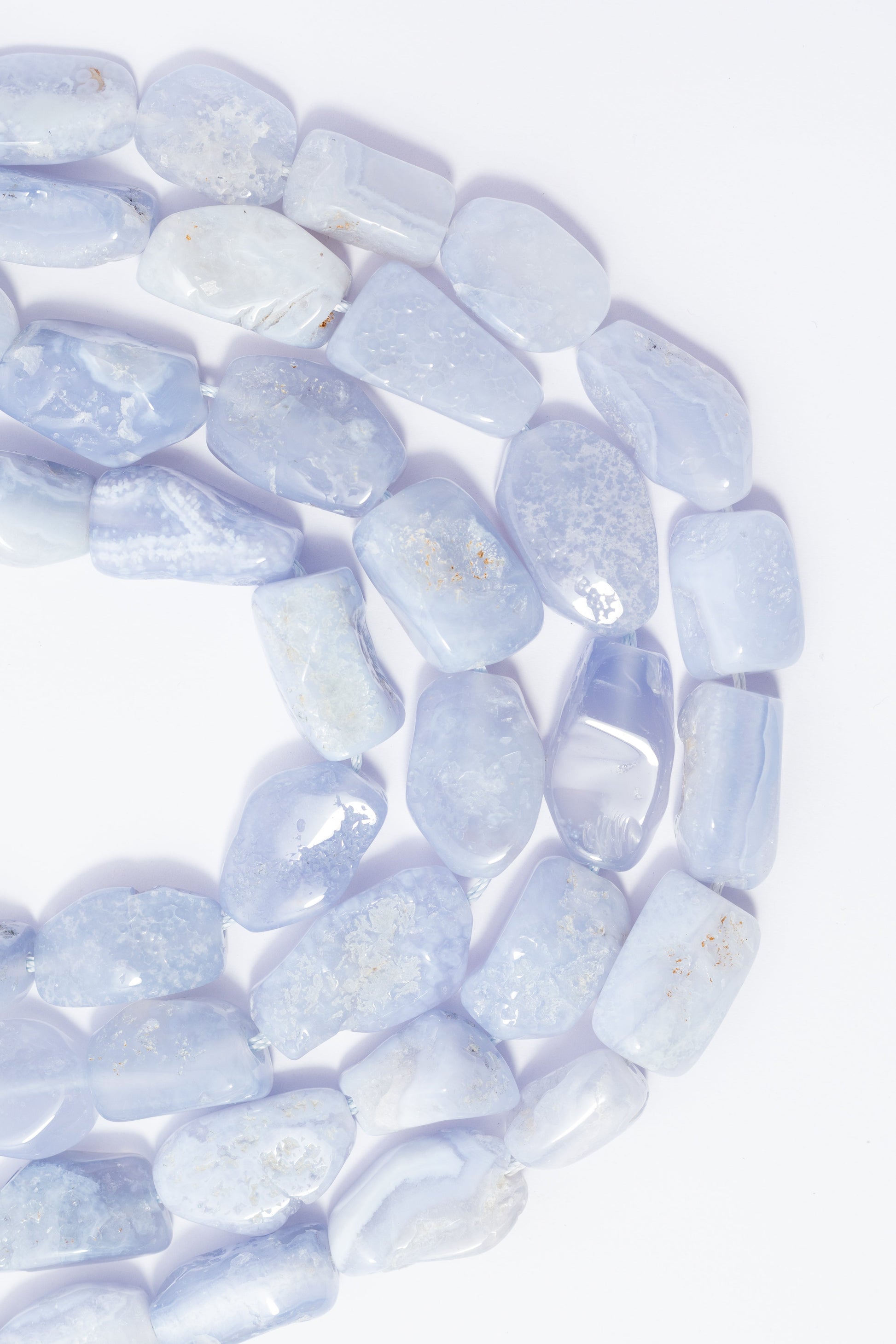 | 13x22mm | 002851 | 686.4 | Cuentas de Ágata natural de Tamaño grande, con forma irregular (nugget) y acabado liso y pulido sin facetas. Color azul lavanda o celeste pÁlido uniforme, con un look transl̼cido y suave. Ideales para collares statement de estilo orgÁnico o pulseras que busquen una estética calmante y una forma natural sin brillo. |