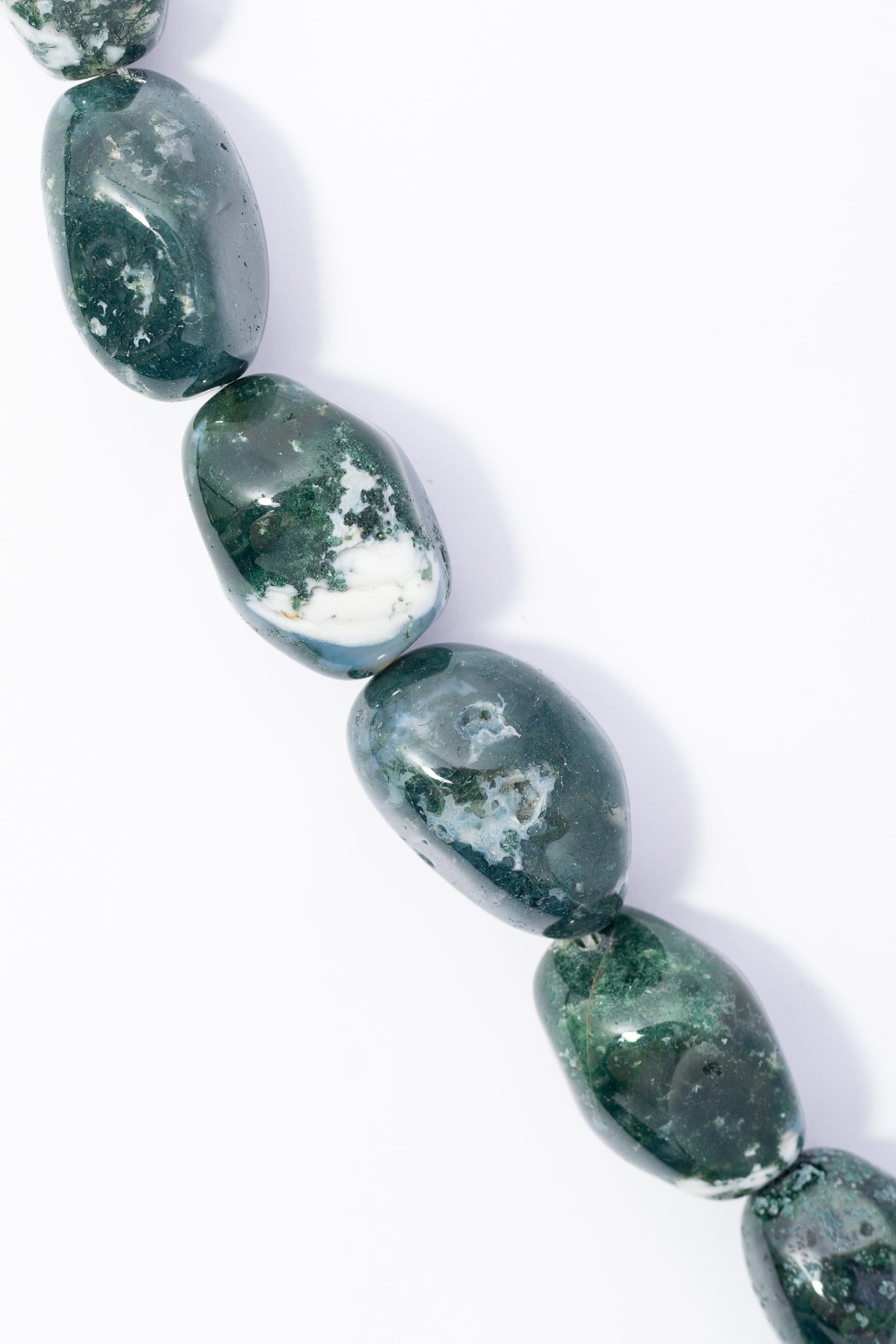 | 20x32mm | 004357 | 1276.8 | Cuentas de Ágata natural de Tamaño grande, con forma irregular pulida (tumbled) y acabado liso. Color verde profundo con inclusiones blancas y negras que recuerdan al musgo y el follaje. Ideales para joyería statement r̼stica y orgÁnica, como collares de una sola hebra que busquen una textura visual boscosa y un color intenso. |