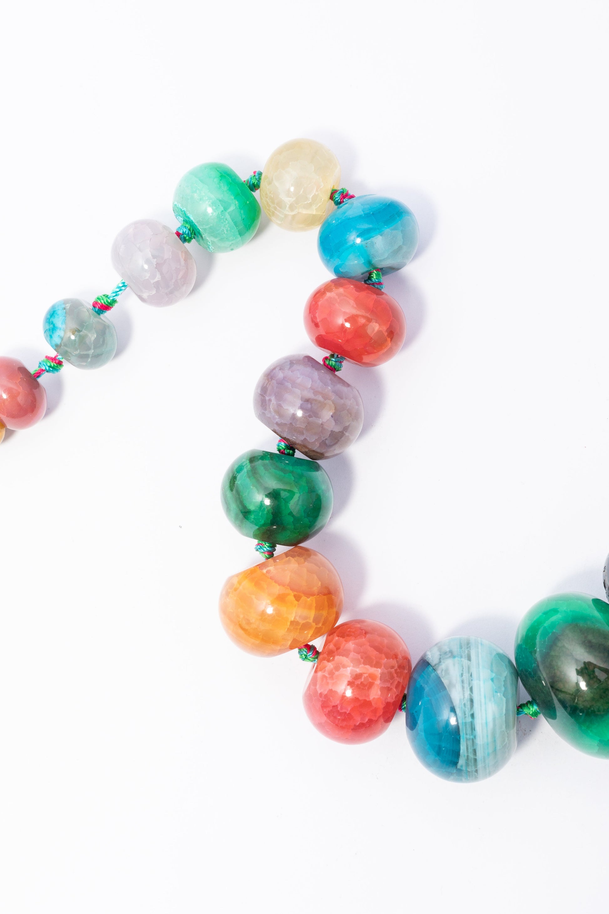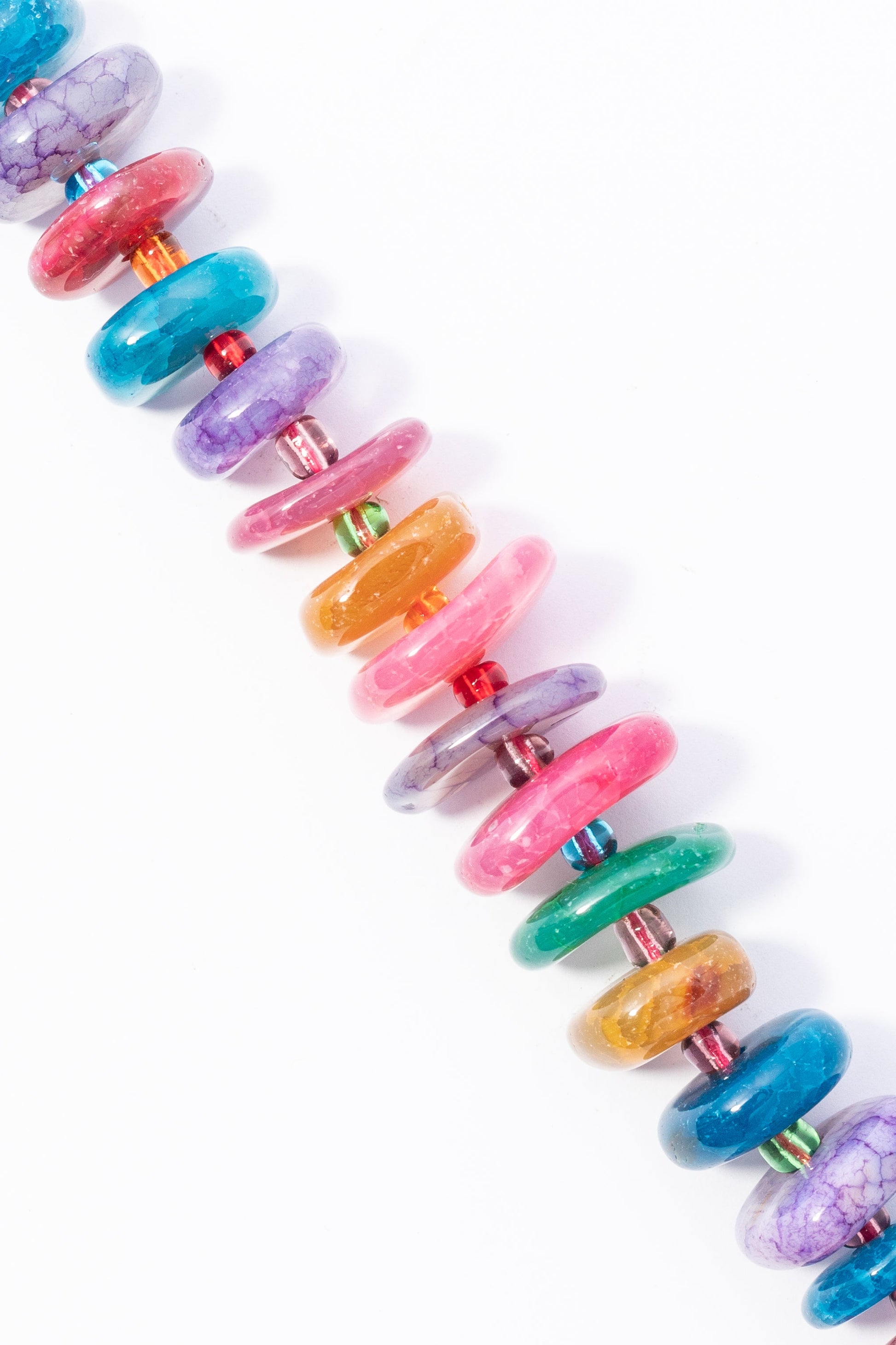 Cuentas de Ágata natural con forma de disco plano irregular y acabado pulido. Mezcla vibrante de colores (fucsia, turquesa, morado, naranja, verde) separados por pequeñas cuentas de acento. Ideales para collares statement llamativos o pulseras que busquen un diseño grÁfico, alegre y moderno.