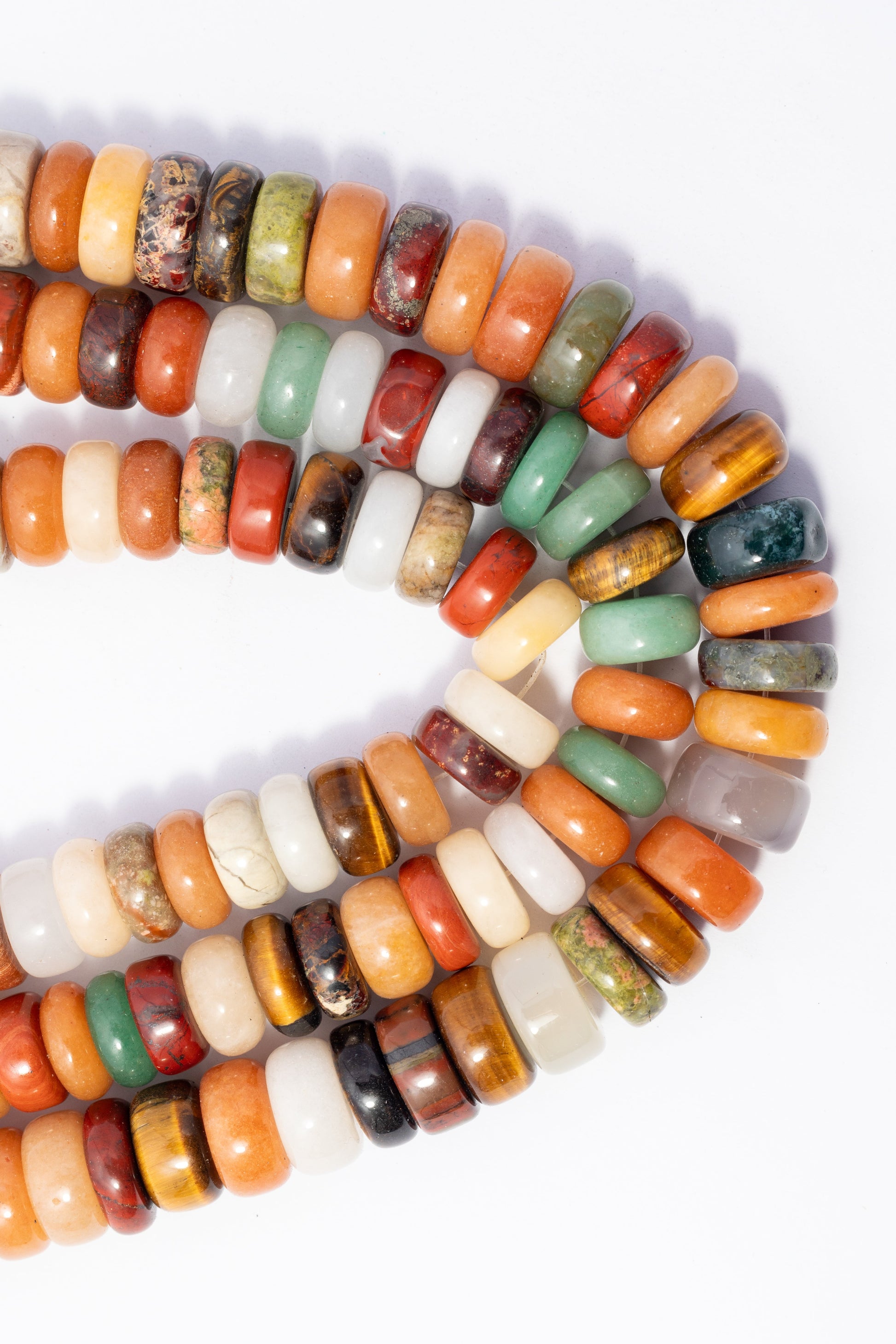 | 15-16mm | 002289 | 784.8 | Cuentas de piedras naturales con forma de disco plano (rondel) y acabado liso y pulido. Mezcla rica y variada que incluye Ágatas, jaspes y ojos de tigre, en tonalidades de verde, óxido, marrón, naranja y crema. Ideales para joyería boho y r̼stica o pulseras de acento que busquen textura orgÁnica y una paleta de colores terrenal. |