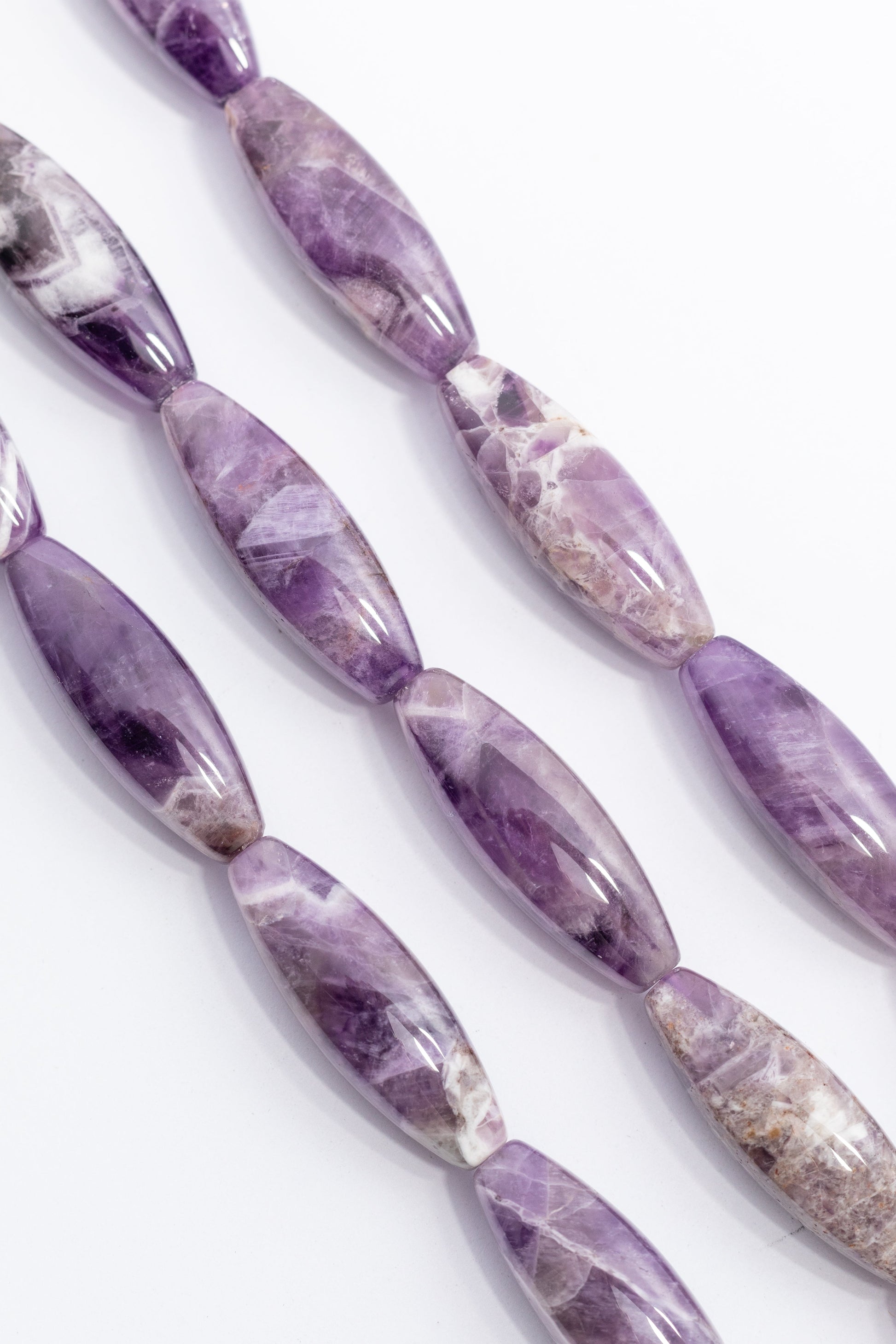 Cuentas de amatista natural de Tamaño grande, con forma de arroz (ovalada alargada) y acabado liso y pulido. El color presenta un dramÁtico veteado que mezcla p̼rpura real, blanco lechoso y marrón óxido. Ideales para collares statement de diseño moderno o pulseras que busquen una silueta elegante y una textura visual impactante.