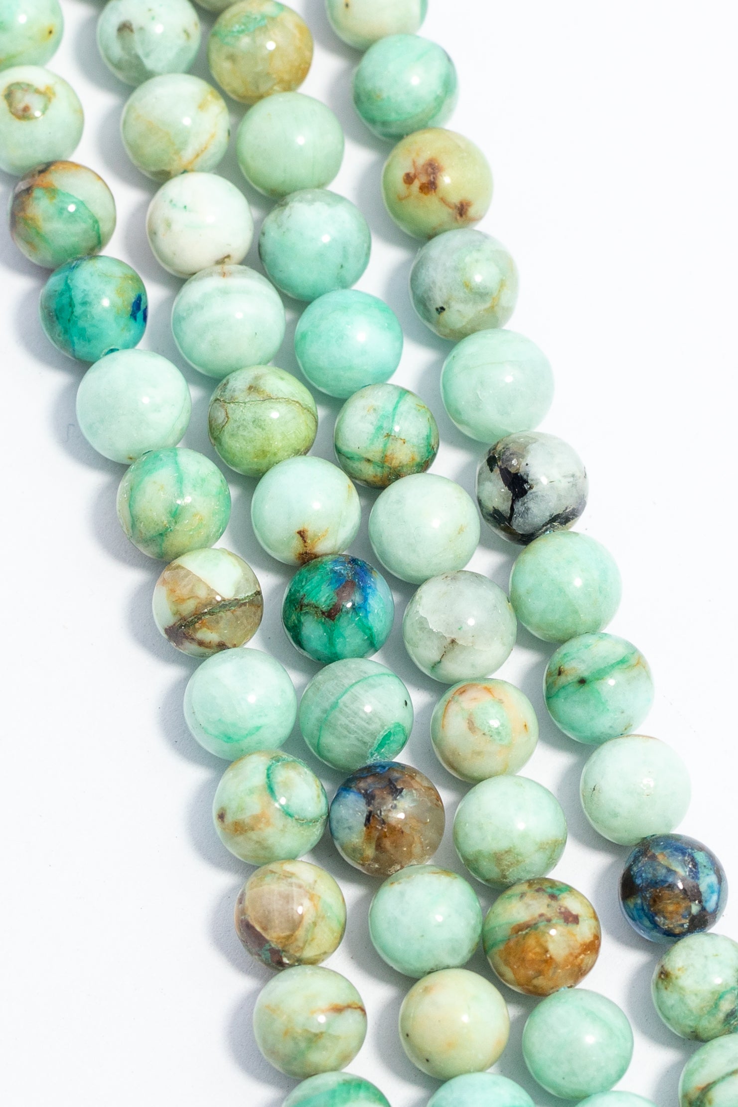 Cuentas esféricas de azurita natural con un acabado liso y pulido. Presentan una rica mezcla de colores que incluyen verde menta pÁlido, marrón óxido, blanco y toques de azul intenso. Ideales para joyería boho o diseños de primavera, como pulseras o collares que busquen un color orgÁnico, suave y terrenal.