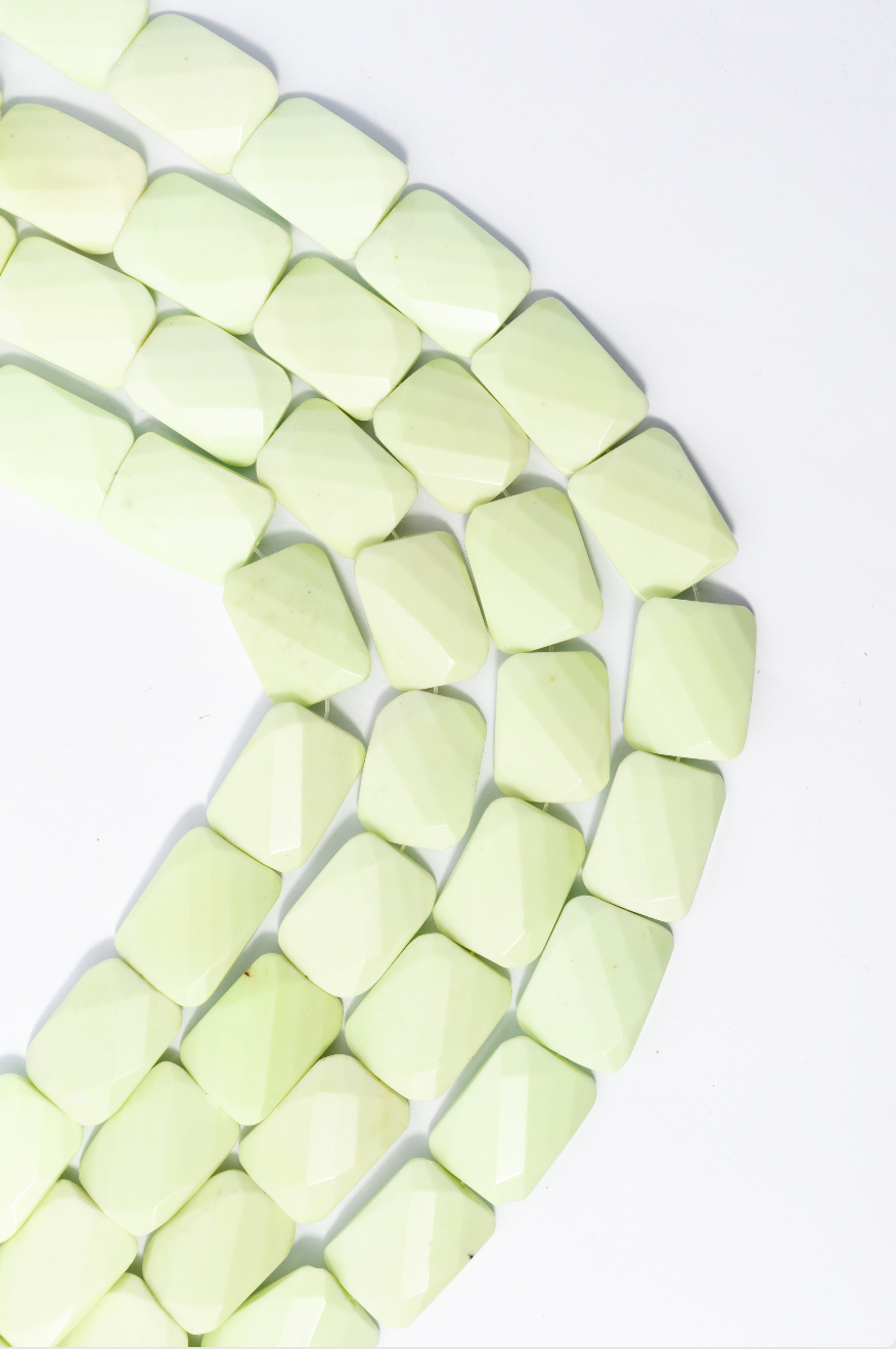 Cuentas de crisoprasa natural de Tamaño grande, con forma rectangular (cabujón) facetada que añade un brillo sutil. Color verde lima muy pÁlido, casi amarillo con un acabado opaco y cremoso. Ideales para collares statement de diseño moderno, que busquen una silueta geométrica y un color fresco y suave.