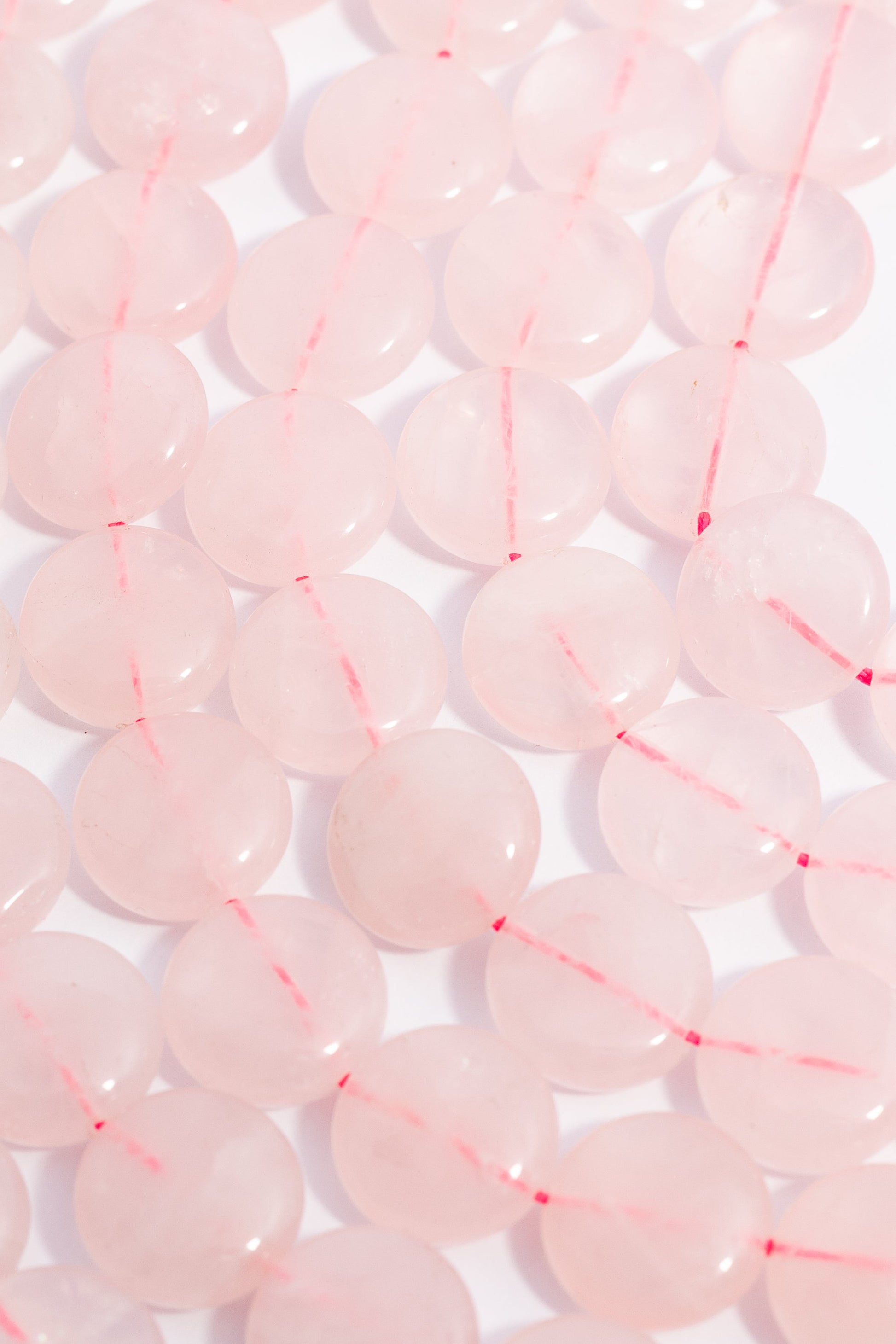 | 15mm | 003031 | 374.4 | Cuentas de piedra natural (cuarzo rosa) de Tamaño grande, con forma de disco/moneda pulida que acent̼a su suavidad. Color rosa pÁlido, suave y uniforme, con opacidad trasl̼cida y ligeros velos internos. Ideales para joyería moderna, de declaración o de acento, que busquen un color calmante y una silueta plana y orgÁnica. |