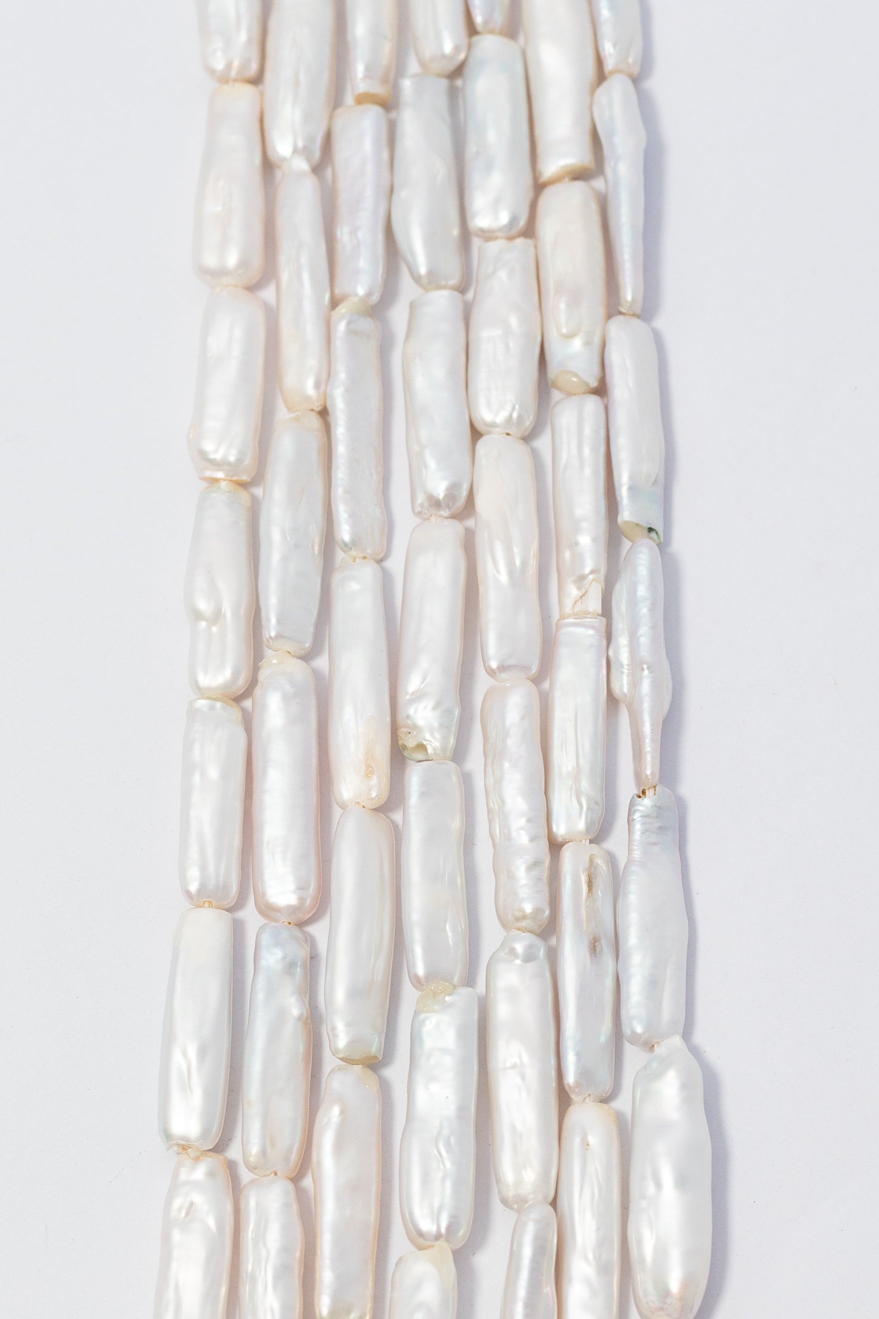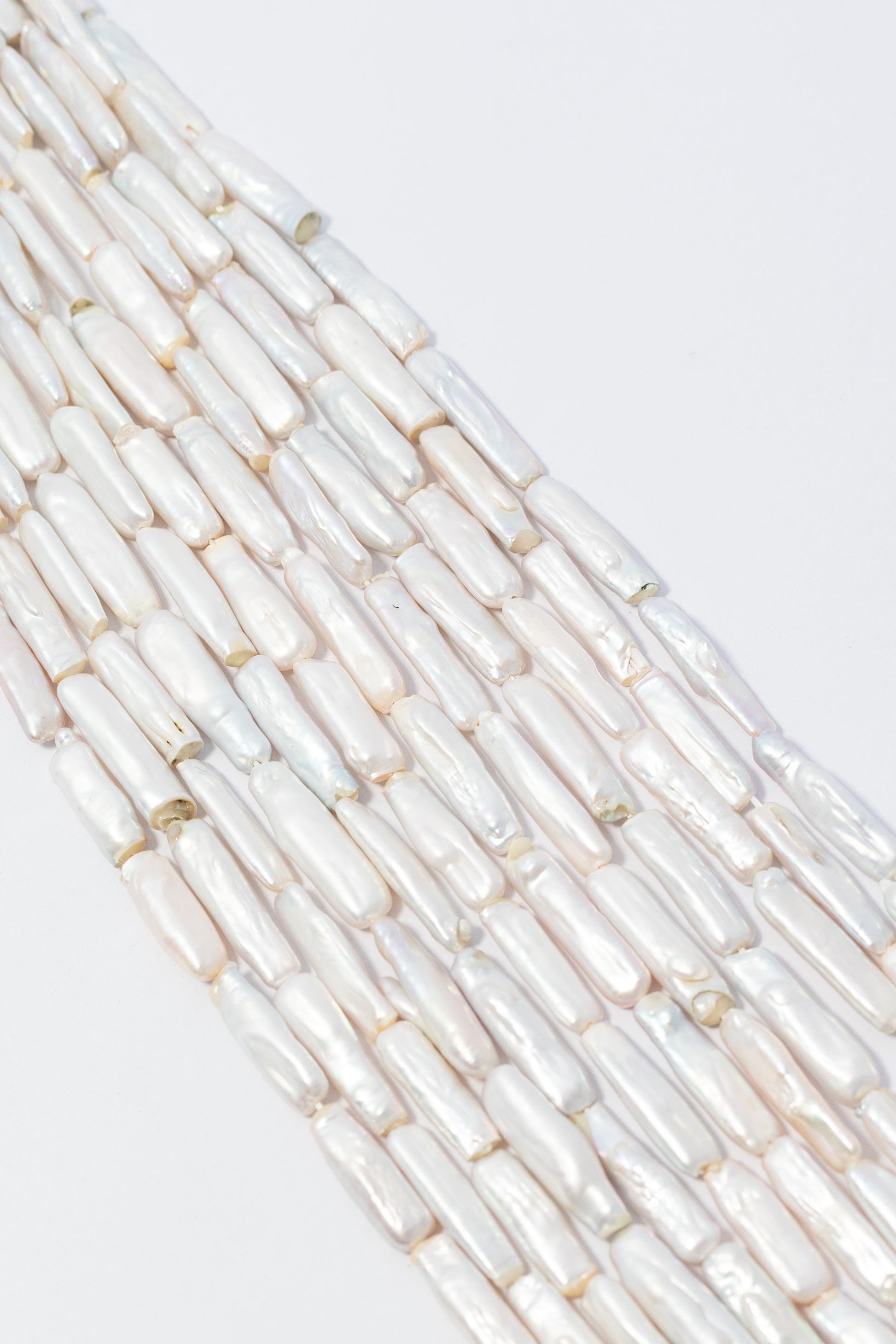 Tira de perlas cultivadas con forma de palo plano que presenta una estructura geométrica alargada y lineal de gran originalidad visual. Su luminosa paleta en blanco nacarado destaca por un brillo irisado intenso, relieves orgánicos y textura suave que realza la elegancia natural de cada gema. Con silueta estilizada y perfil bajo, es perfecta para collares de flecos con movimiento fluido, pendientes vanguardistas de líneas arquitectónicas o accesorios nupciales con estética minimalista y sofisticada.