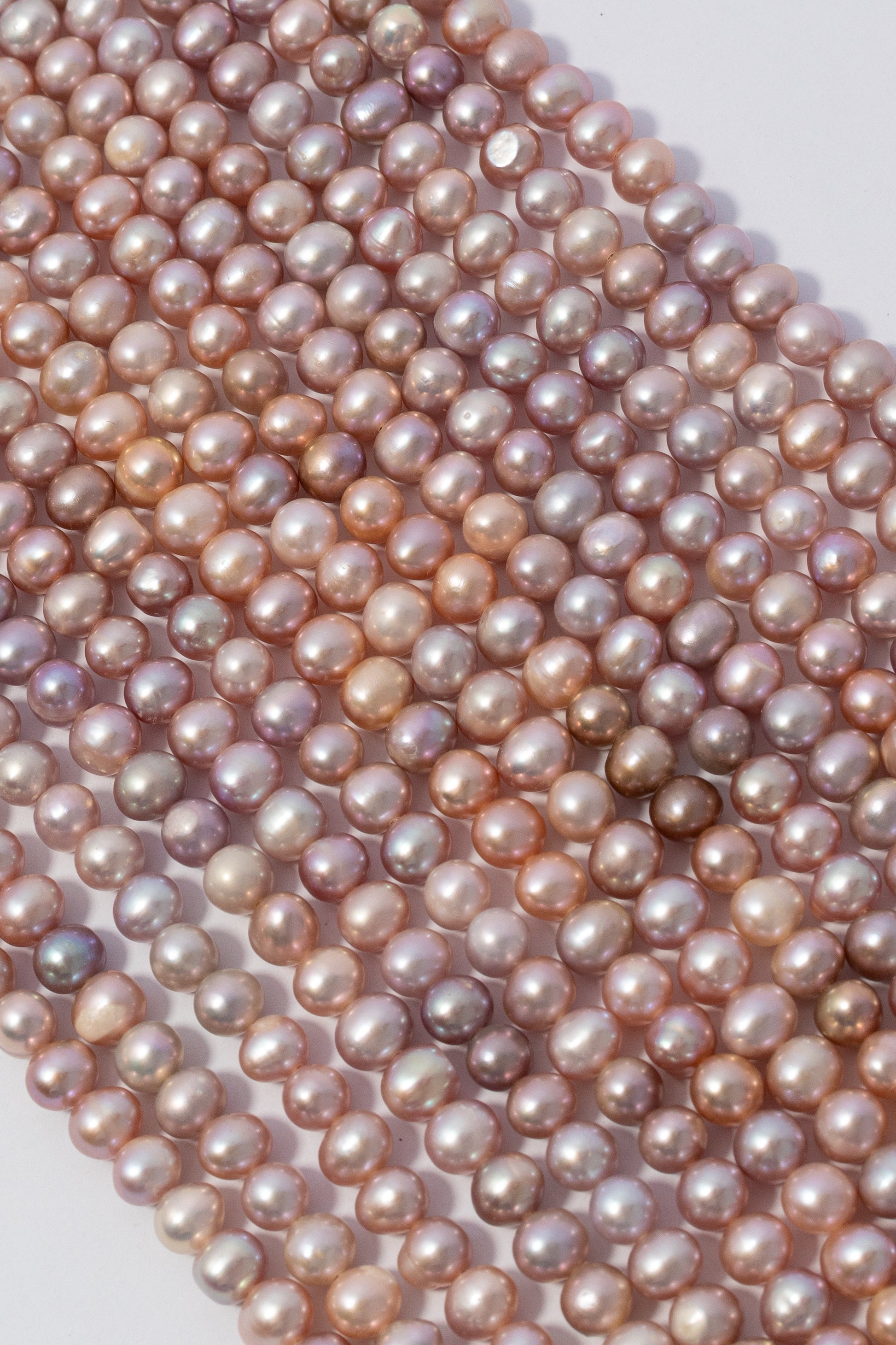 Hilo de perlas cultivadas de forma esférica con estructura geométrica uniforme y compacta. Destaca por su brillo metálico e irisado intenso, con matices profundos en tonos violáceos y rosados que cambian según la luz. Su textura lisa y acabado vibrante lo convierten en un componente versátil para joyería de autor.