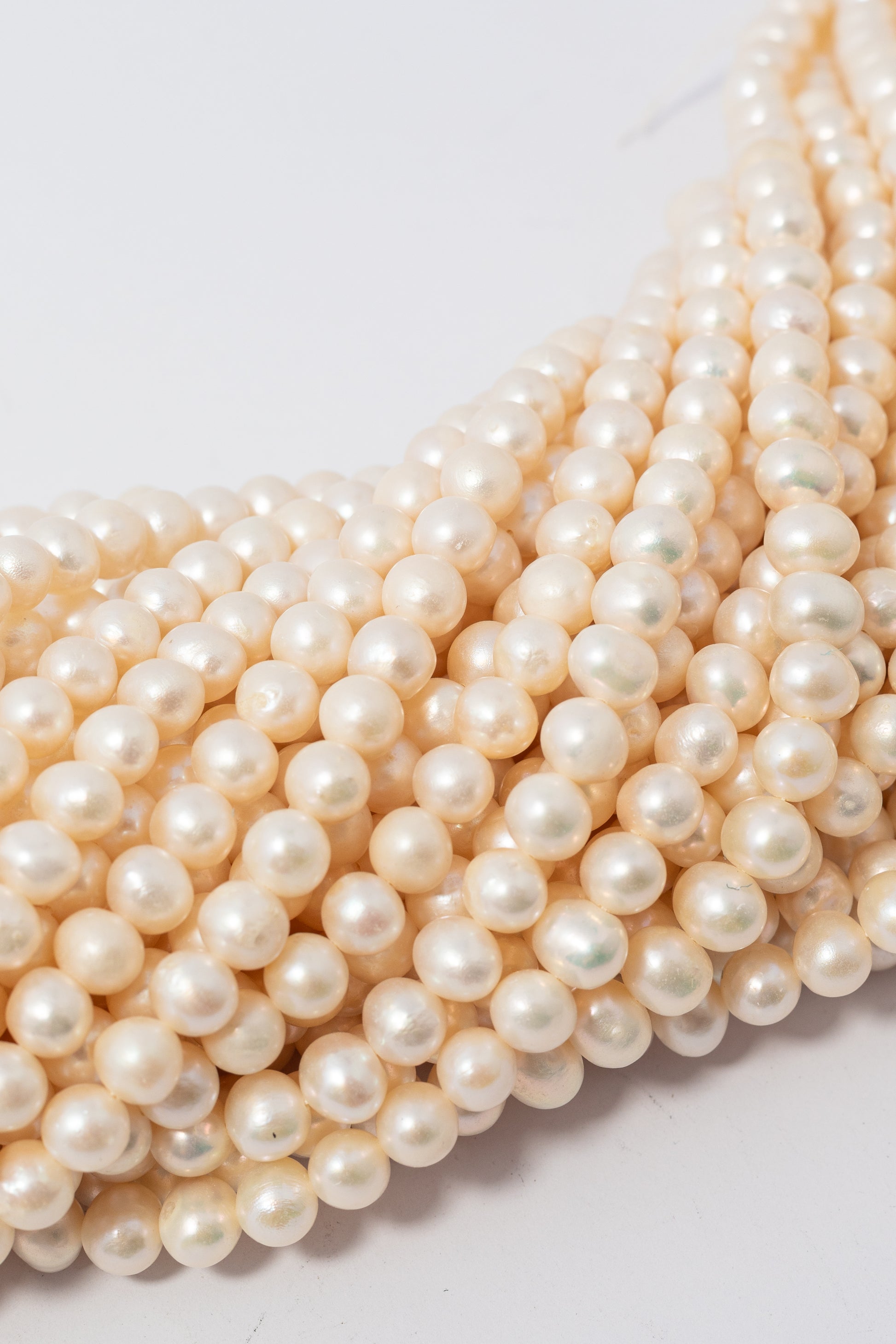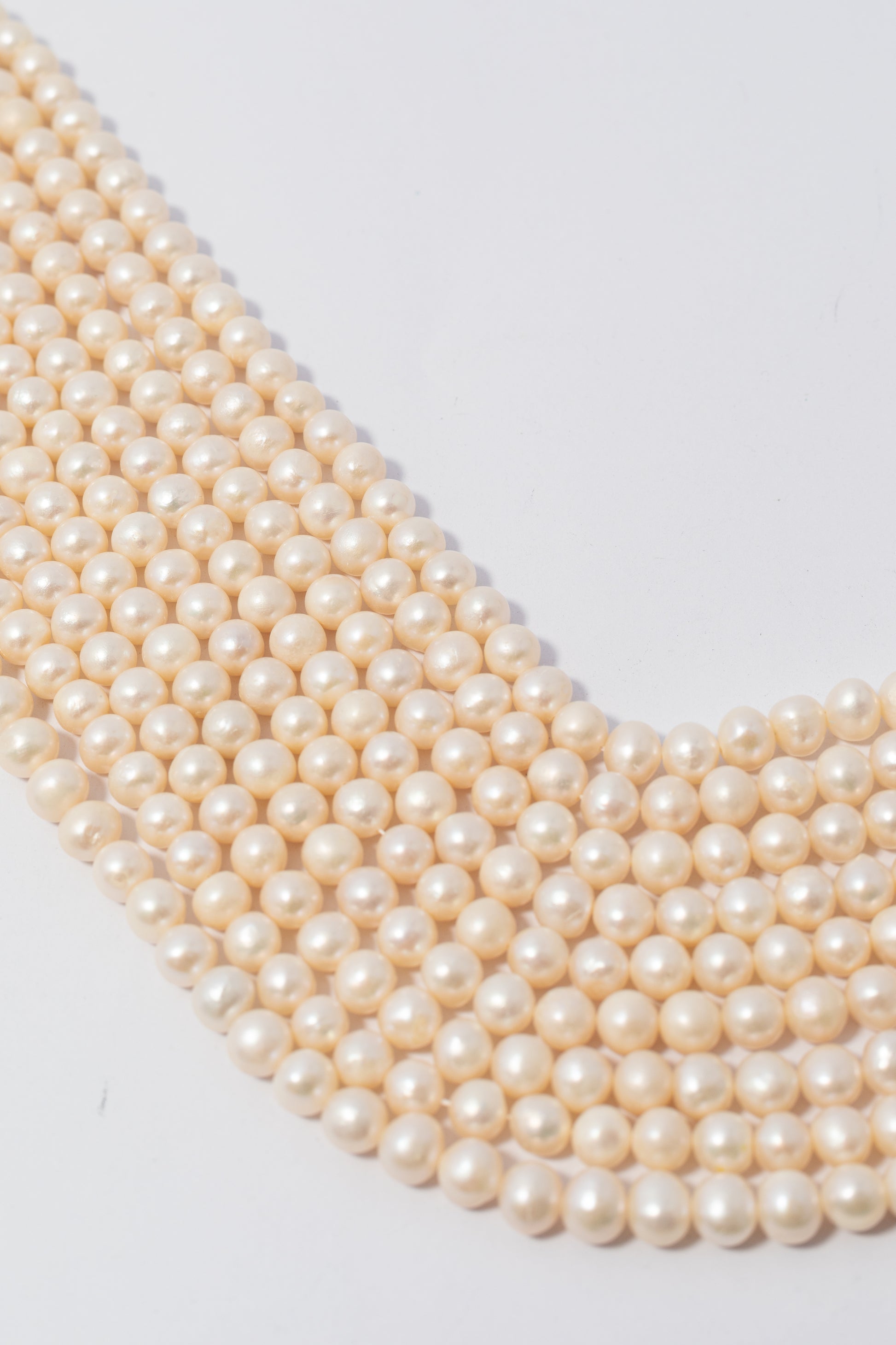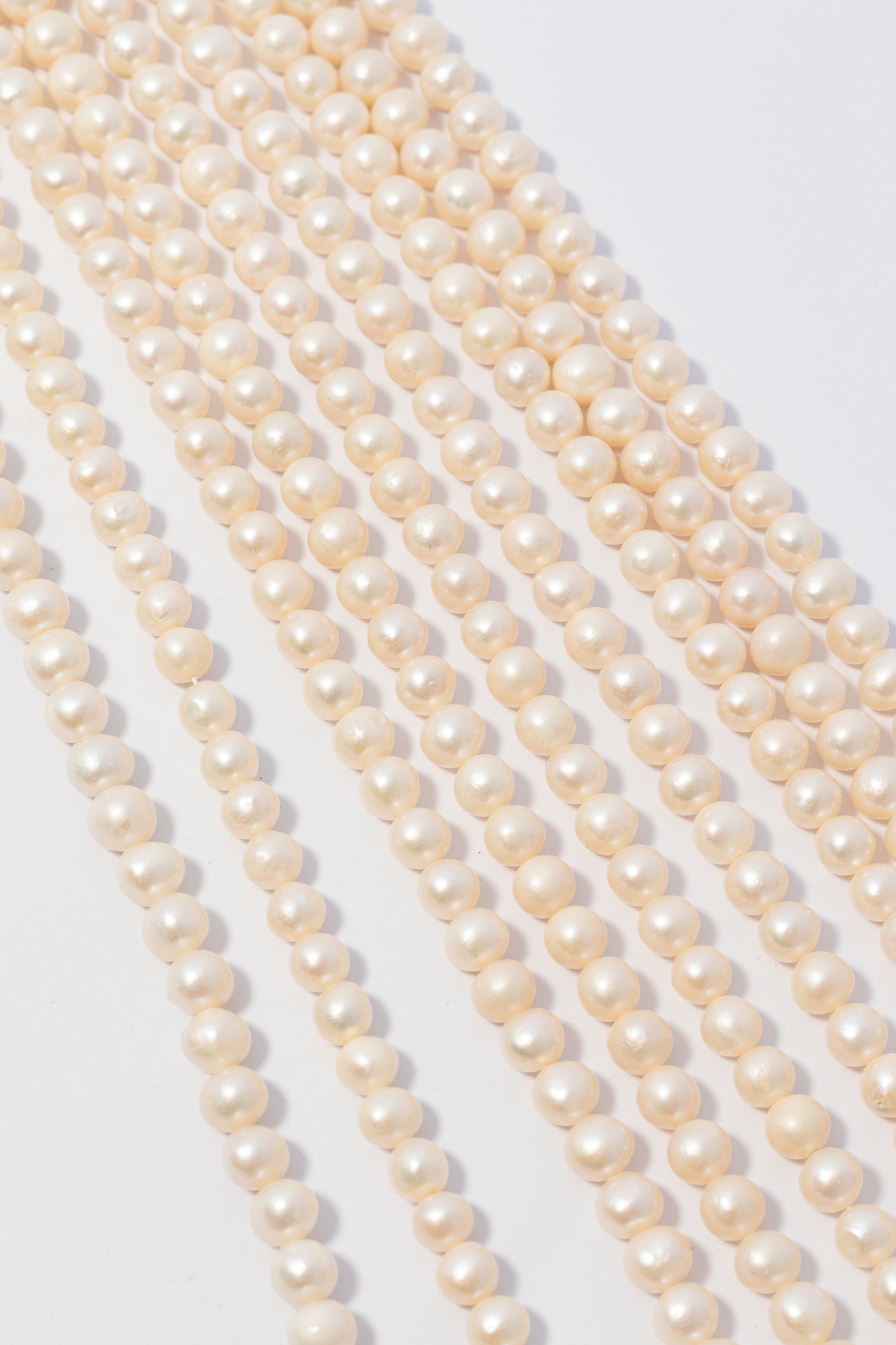 Hilo de perlas cultivadas con forma esférica perfecta, caracterizado por su estructura geométrica uniforme y compacta. Presenta un brillo nacarado suave y luminoso en tonos blanco crema que realza la elegancia clásica. Su textura lisa y tamaño equilibrado lo hacen ideal para crear collares atemporales con ritmo visual armonioso, brazaletes delicados de múltiples hilos o accesorios nupciales sofisticados. Un componente versátil y excepcional para joyería de autor que busca distinción y refinamiento.