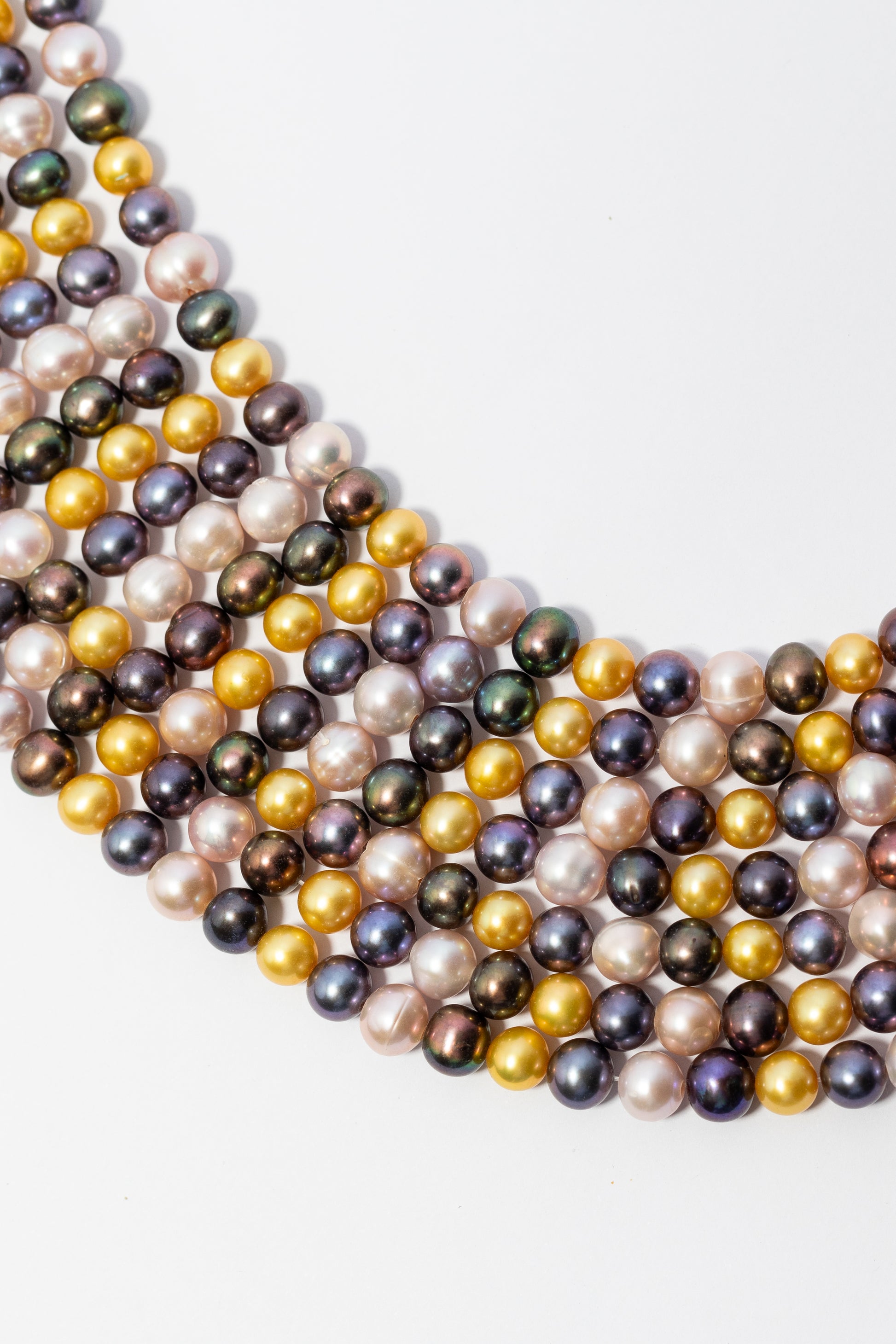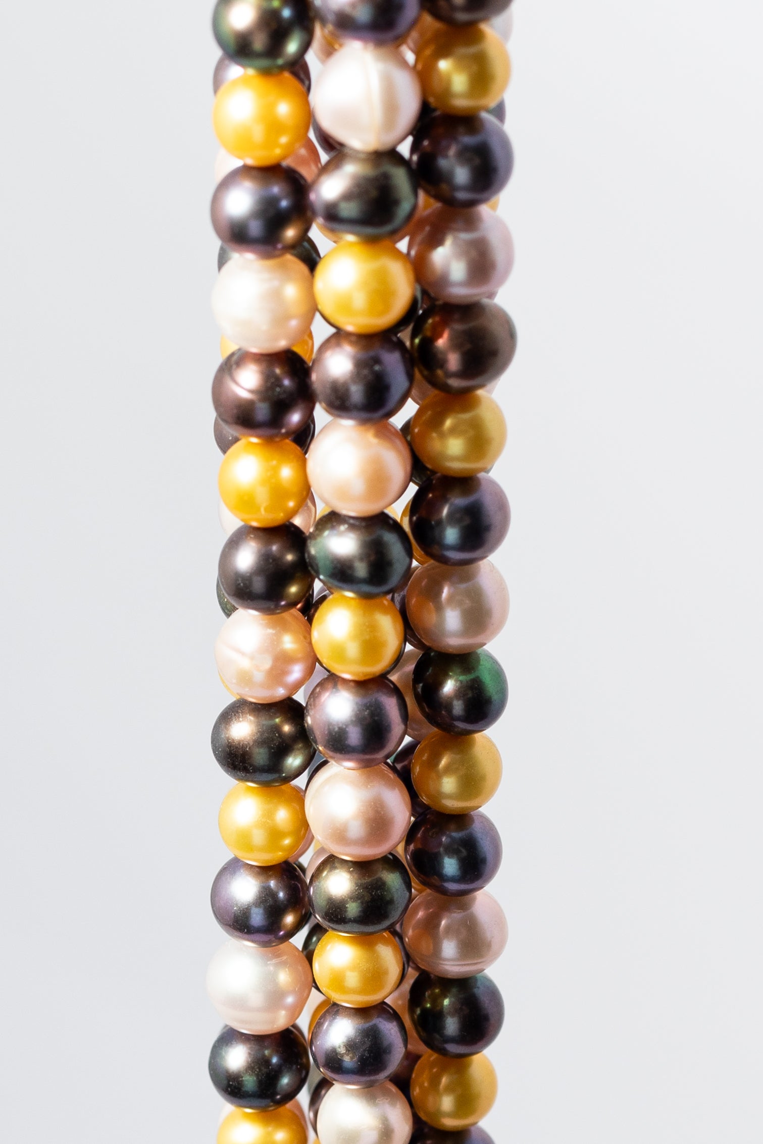 Hilo de perlas cultivadas con forma esférica perfecta, caracterizado por su estructura geométrica uniforme y versátil. Destaca por una vibrante combinación multicolor con brillo nacarado e irisado intenso, mezclando tonos dorados, grises, cobres y cremas que crean un dinamismo visual cautivador. Su diseño clásico y paleta cromática rica lo convierten en un componente ideal para joyería de autor: perfecto para collares con ritmo visual interesante, brazaletes de múltiples hilos con gran profundidad de matices, o accesorios contemporáneos que busquen elegancia sofisticada y ecléctica.