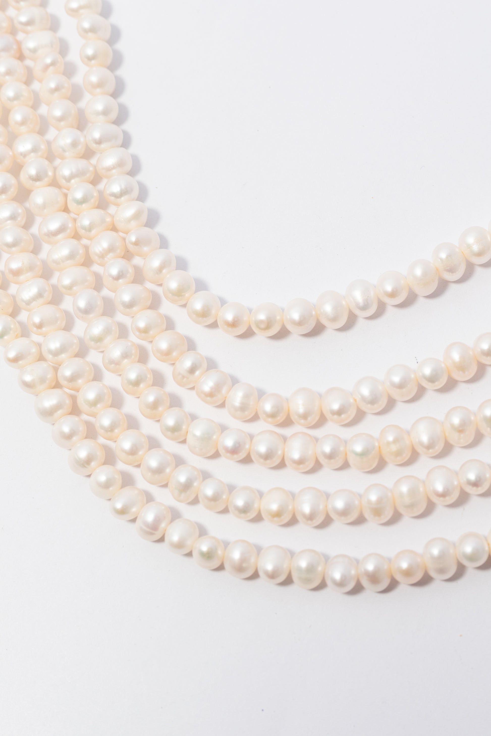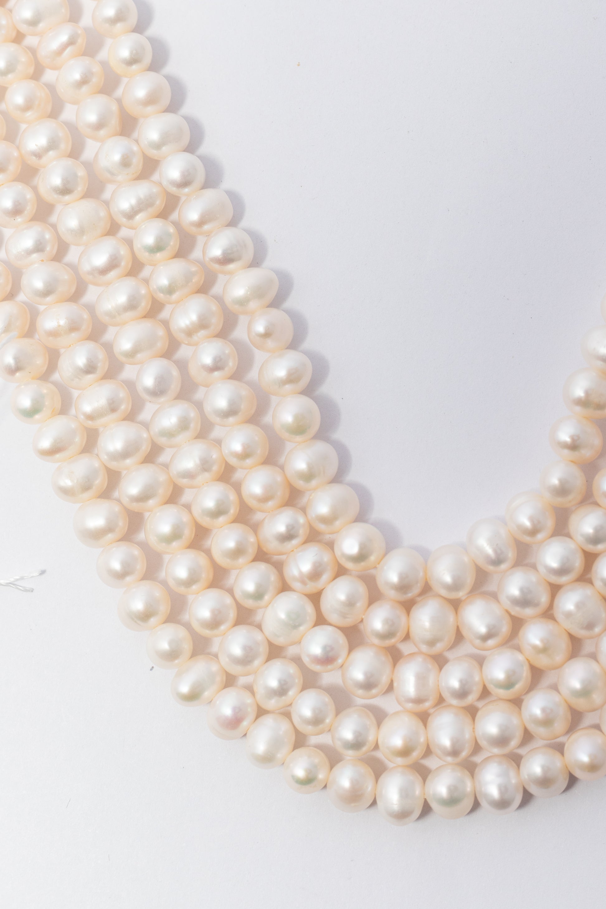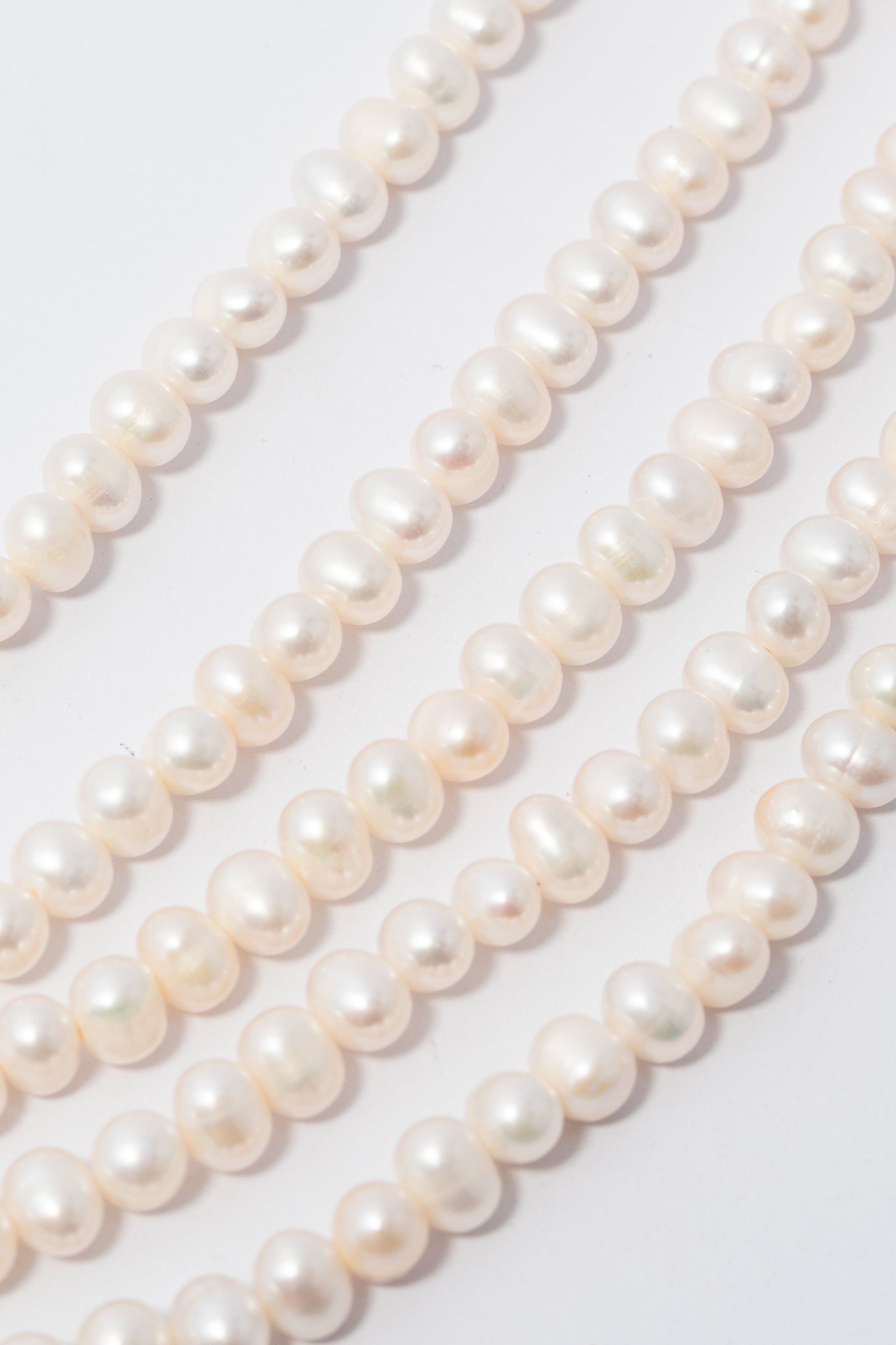 Hilo de perlas cultivadas con forma esférica perfecta, caracterizado por su estructura geométrica uniforme y compacta. Presenta un brillo nacarado suave y luminoso con textura lisa en tonos blanco crema que realza la elegancia clásica. Su tamaño equilibrado y diseño tradicional lo hacen ideal para crear collares atemporales con ritmo visual armonioso, brazaletes delicados de múltiples hilos o accesorios nupciales sofisticados. Un componente versátil y excepcional para joyería de autor.