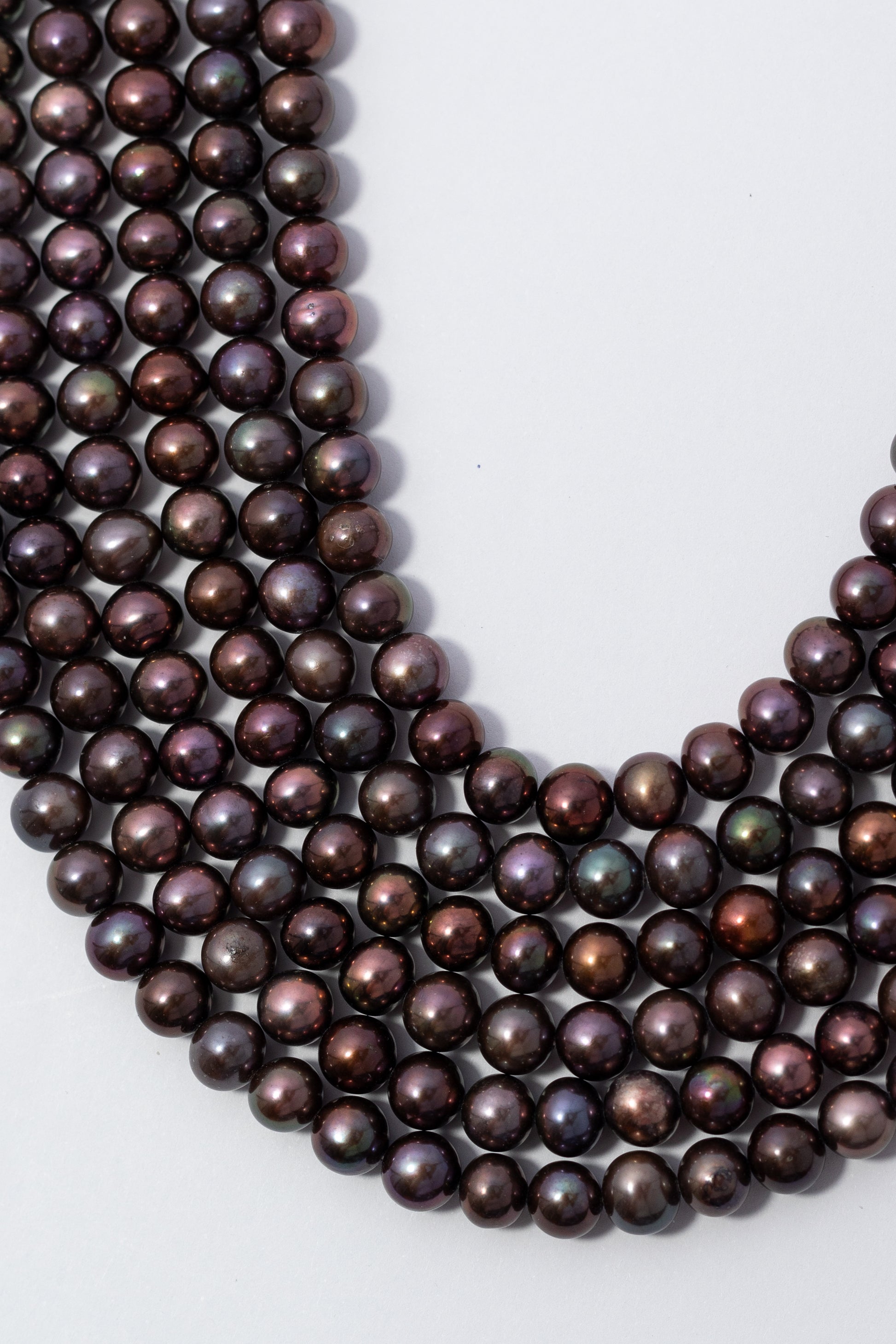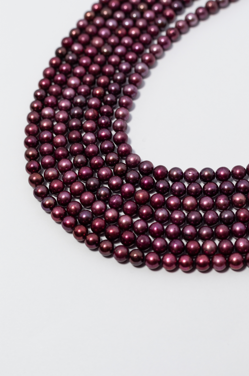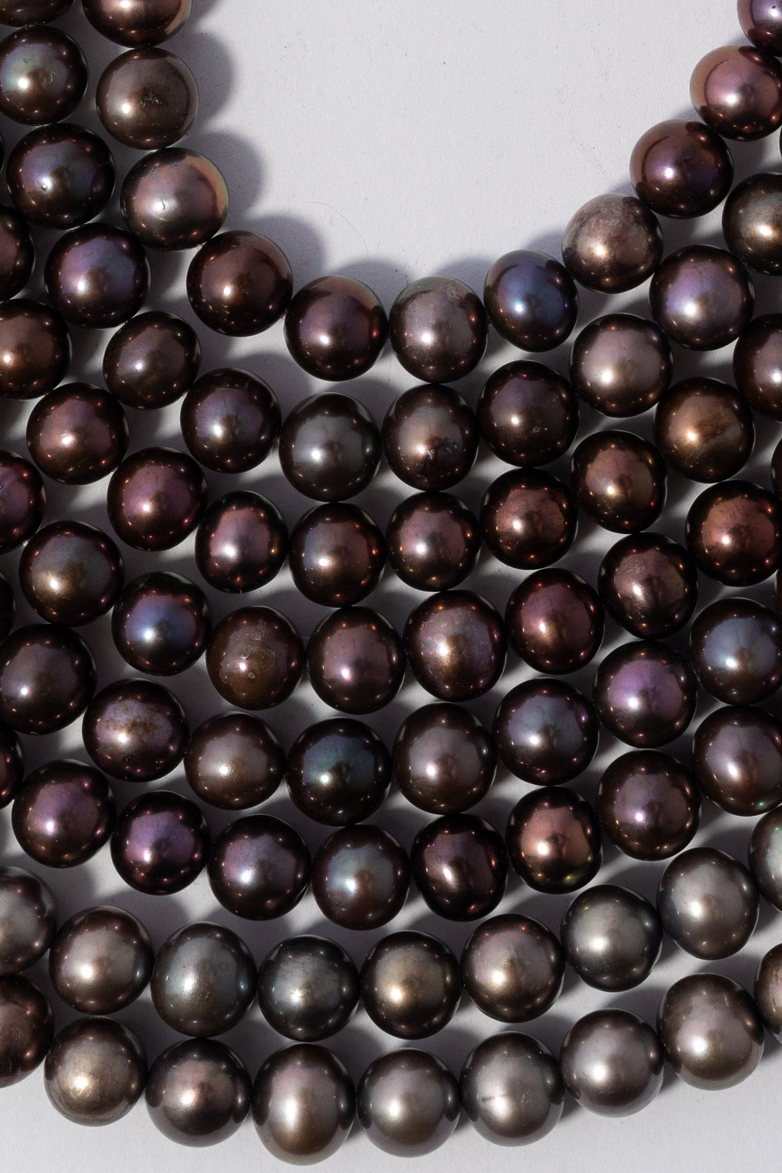 Esta tira de perlas cultivadas presenta esferas perfectamente uniformes con una estructura geométrica compacta y versátil. Su superficie brilla con intensos reflejos metálicos e irisados que cambian con la luz, creando matices profundos sobre una textura lisa y constante. Con su silueta clásica y acabado vibrante, es ideal para collares contemporáneos con ritmo visual equilibrado, brazaletes delicados de múltiples hilos o accesorios nocturnos que demanden elegancia sofisticada e impacto visual. Un componente excepcional para joyería de autor.
