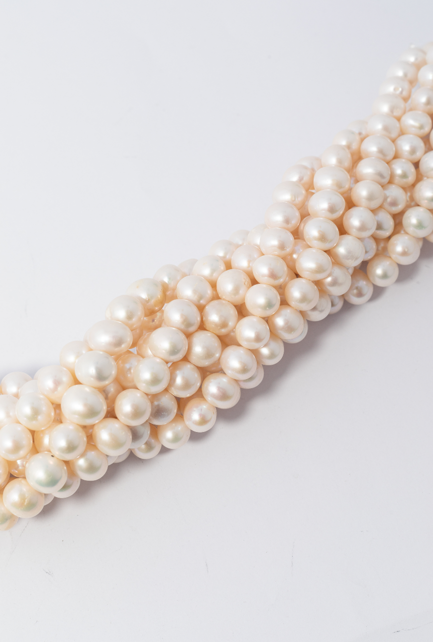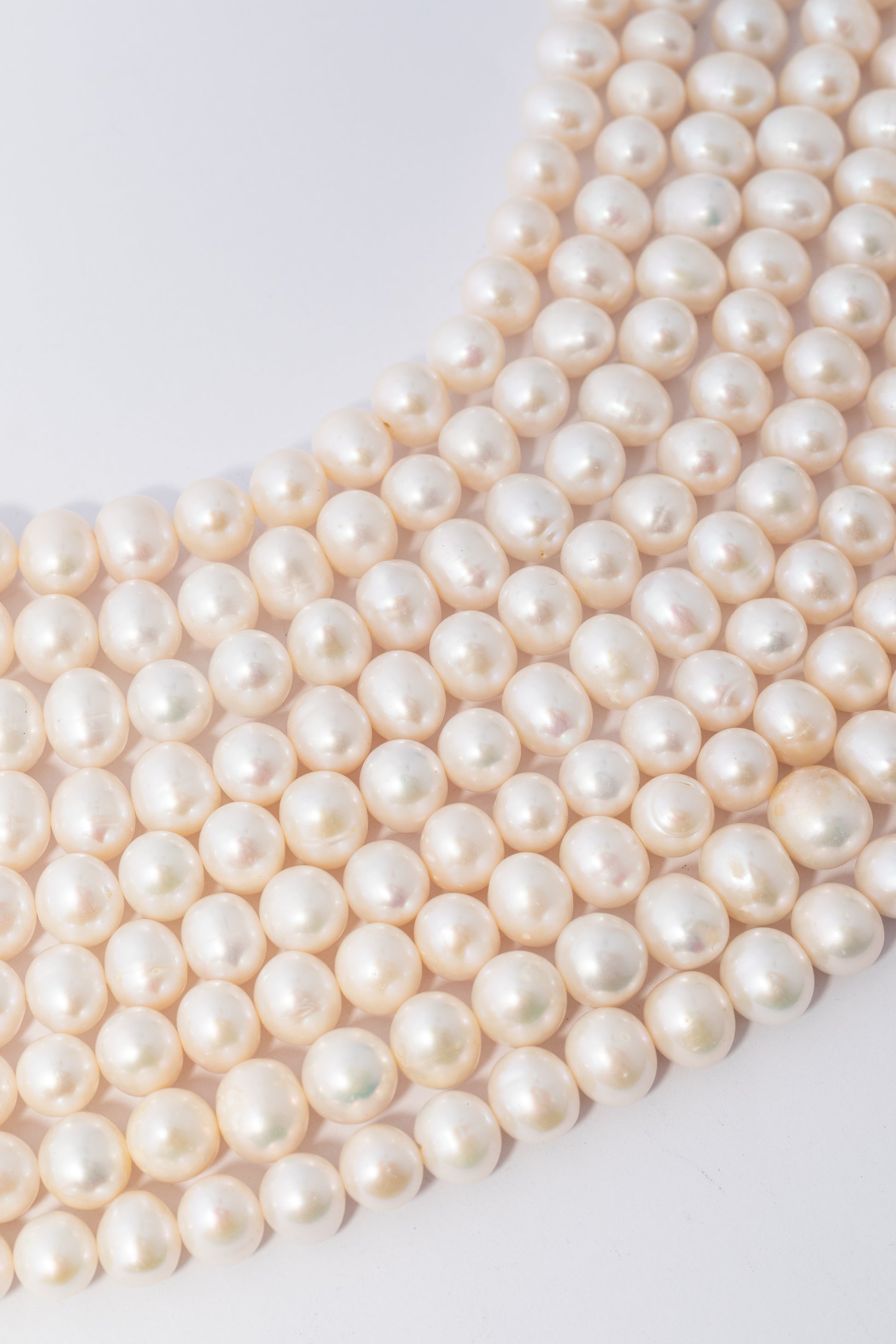Hilo de perlas cultivadas con forma esférica perfecta, caracterizado por su estructura geométrica uniforme y compacta. Presenta un brillo nacarado suave y luminoso con textura lisa en tonos blanco crema que realza la elegancia clásica. Su tamaño prominente y diseño tradicional lo convierten en un componente excepcional para joyería de autor, ofreciendo versatilidad estética para creaciones sofisticadas y personalizadas.