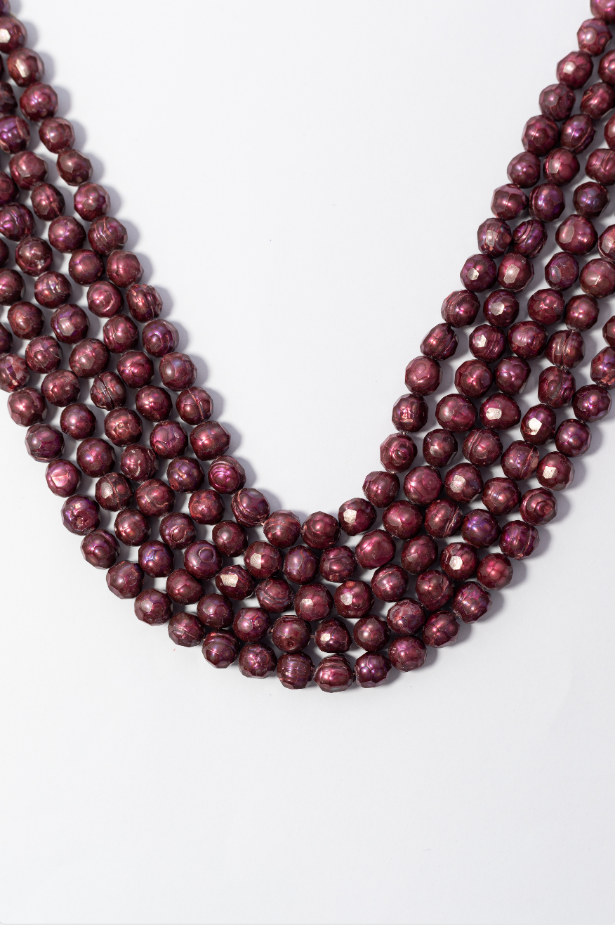 Esta tira de piezas presenta un diseño de perlas cultivadas con forma circular, caracterizada por una estructura geométrica uniforme y compacta con textura visualmente rica. Su acabado facetado e irregular ofrece una superficie de brillo metálico e irisado muy intenso, con matices púrpuras y granates que multiplican los reflejos de luz gracias a sus múltiples caras talladas.