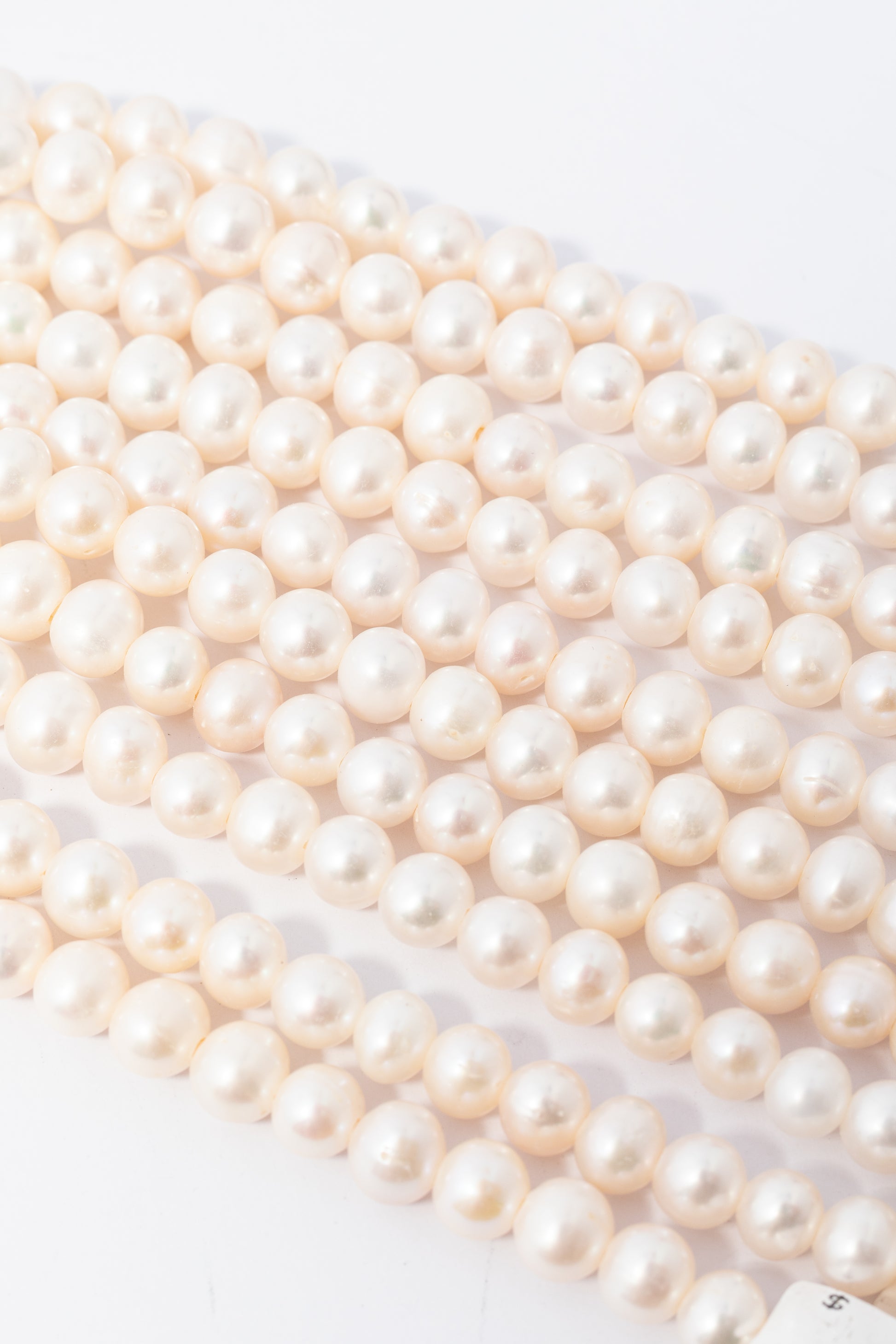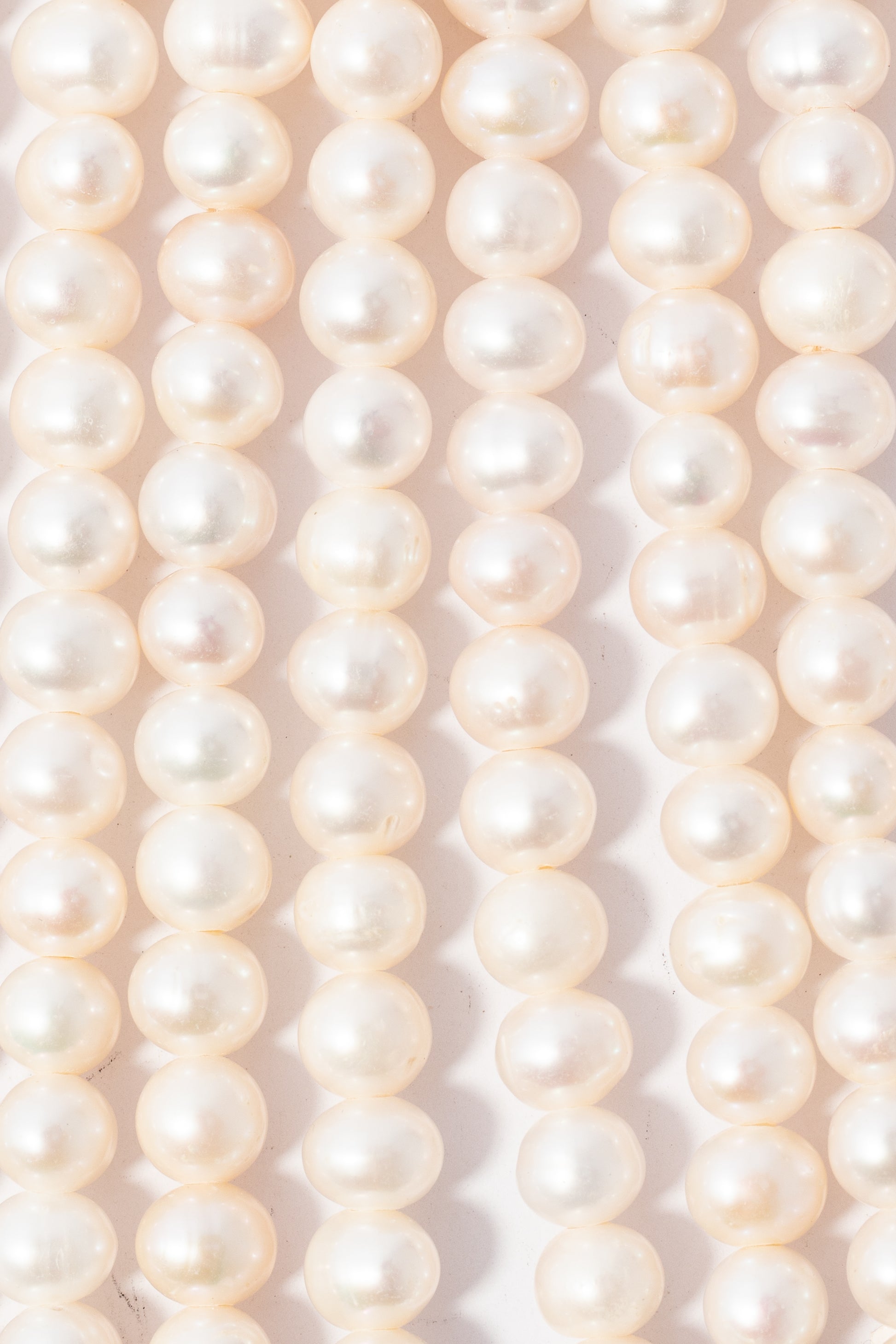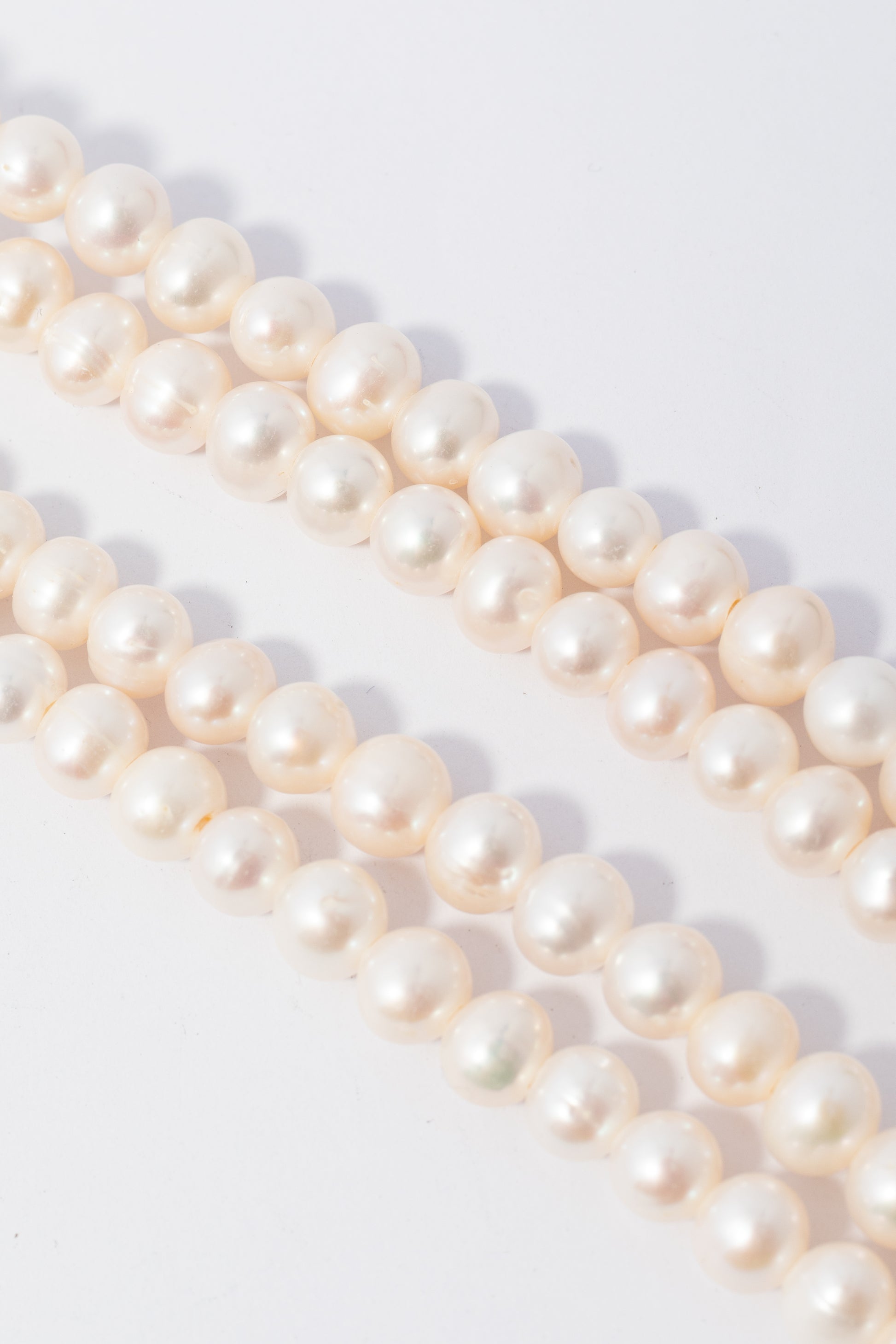 Esta tira de piezas presenta un diseño de perlas cultivadas de forma esférica o circular, caracterizada por una estructura geométrica uniforme, compacta y de gran versatilidad estética. Su apariencia destaca por una superficie de brillo nacarado suave y luminoso, que presenta una textura lisa y constante en un tono blanco puro que realza la elegancia clásica de cada gema.