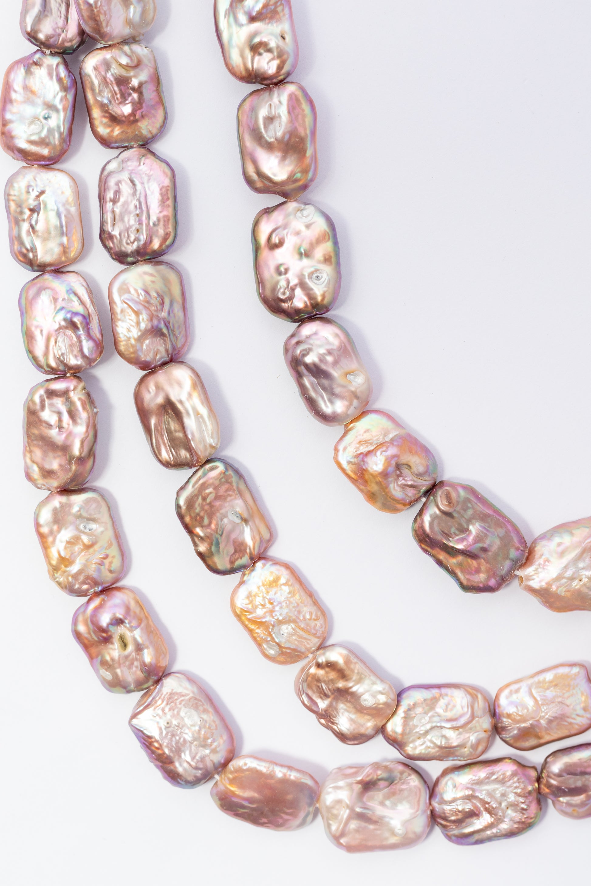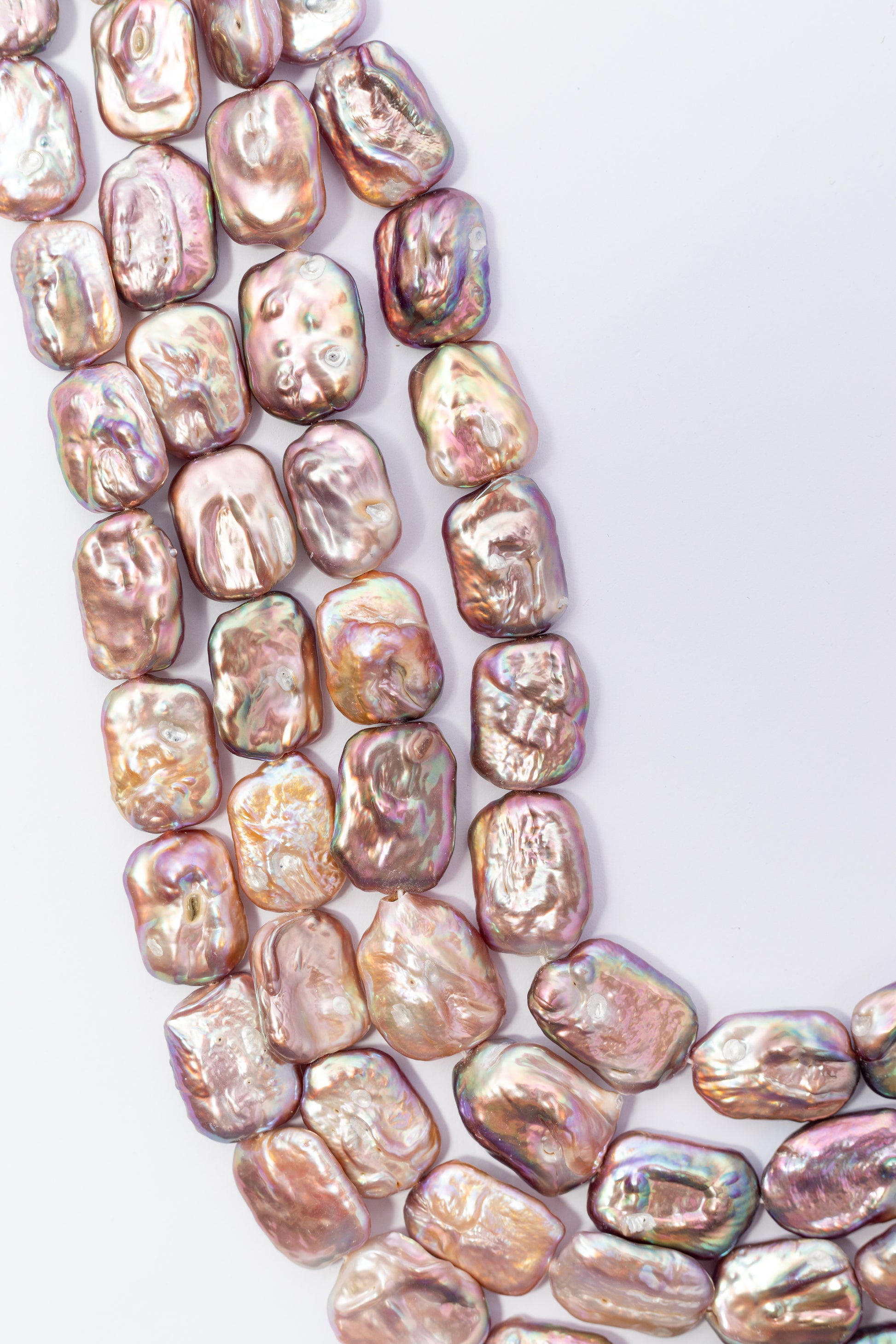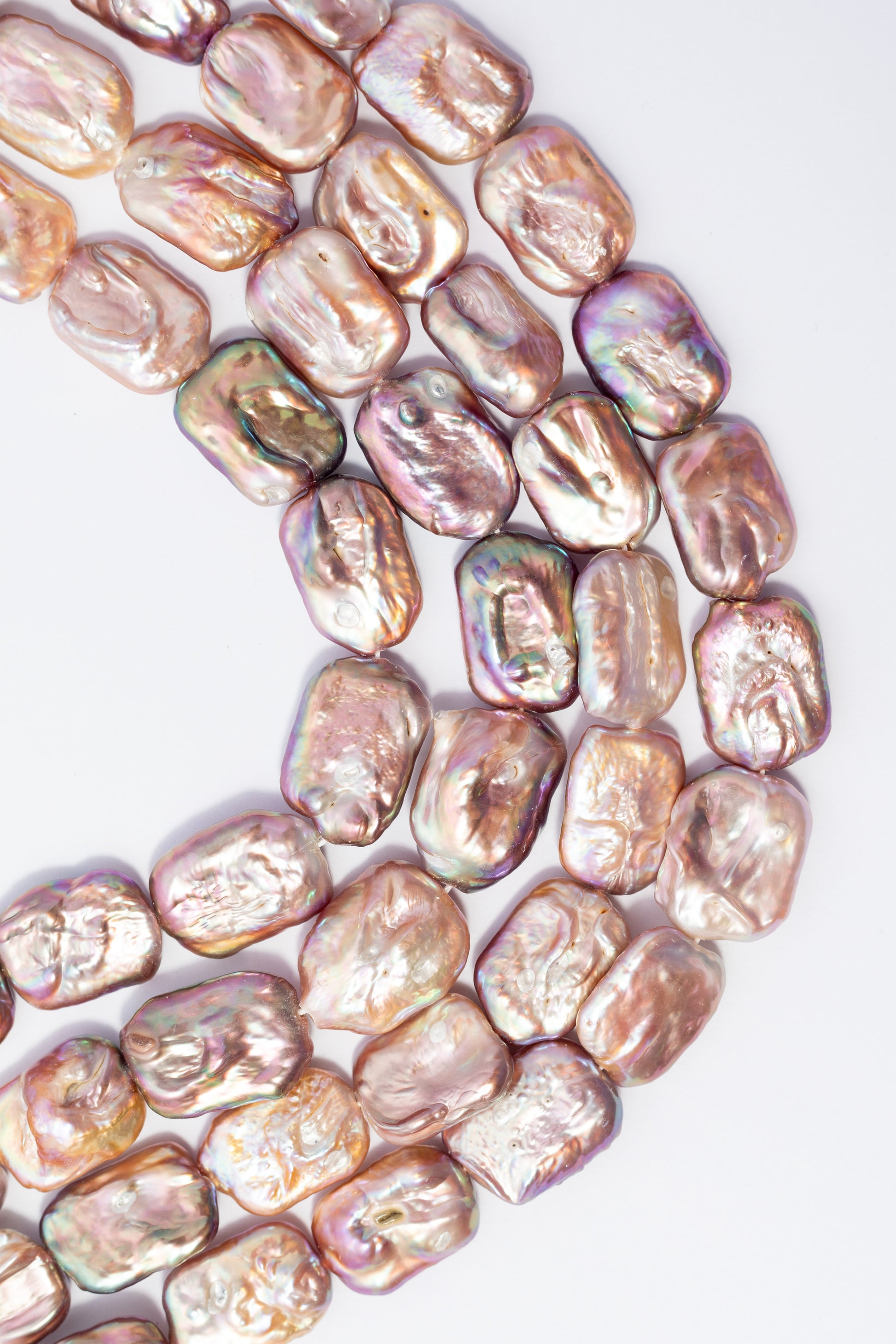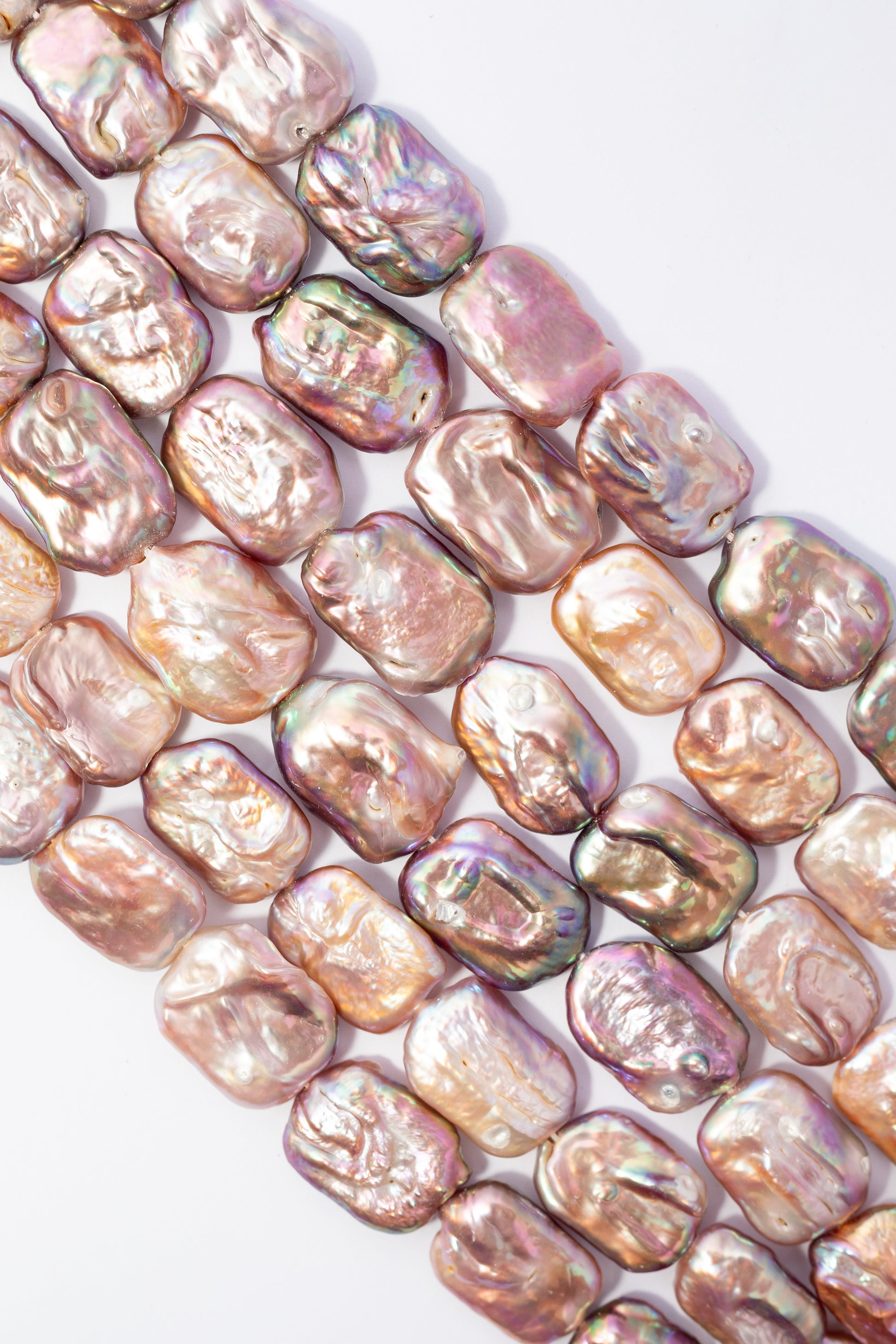 Perlas cultivadas de forma rectangular con estructura geométrica audaz y asimétrica que destaca por su presencia escultural. Su superficie nacarada e irisada refleja matices cambiantes en tonos rosa cobrizo y lavanda según la luz, revelando relieves naturales únicos. Perfectas para crear collares y brazaletes contemporáneos con carácter distintivo, estas piezas ofrecen una estética sofisticada y orgánica ideal para joyería de autor que busca impacto visual y elegancia moderna.