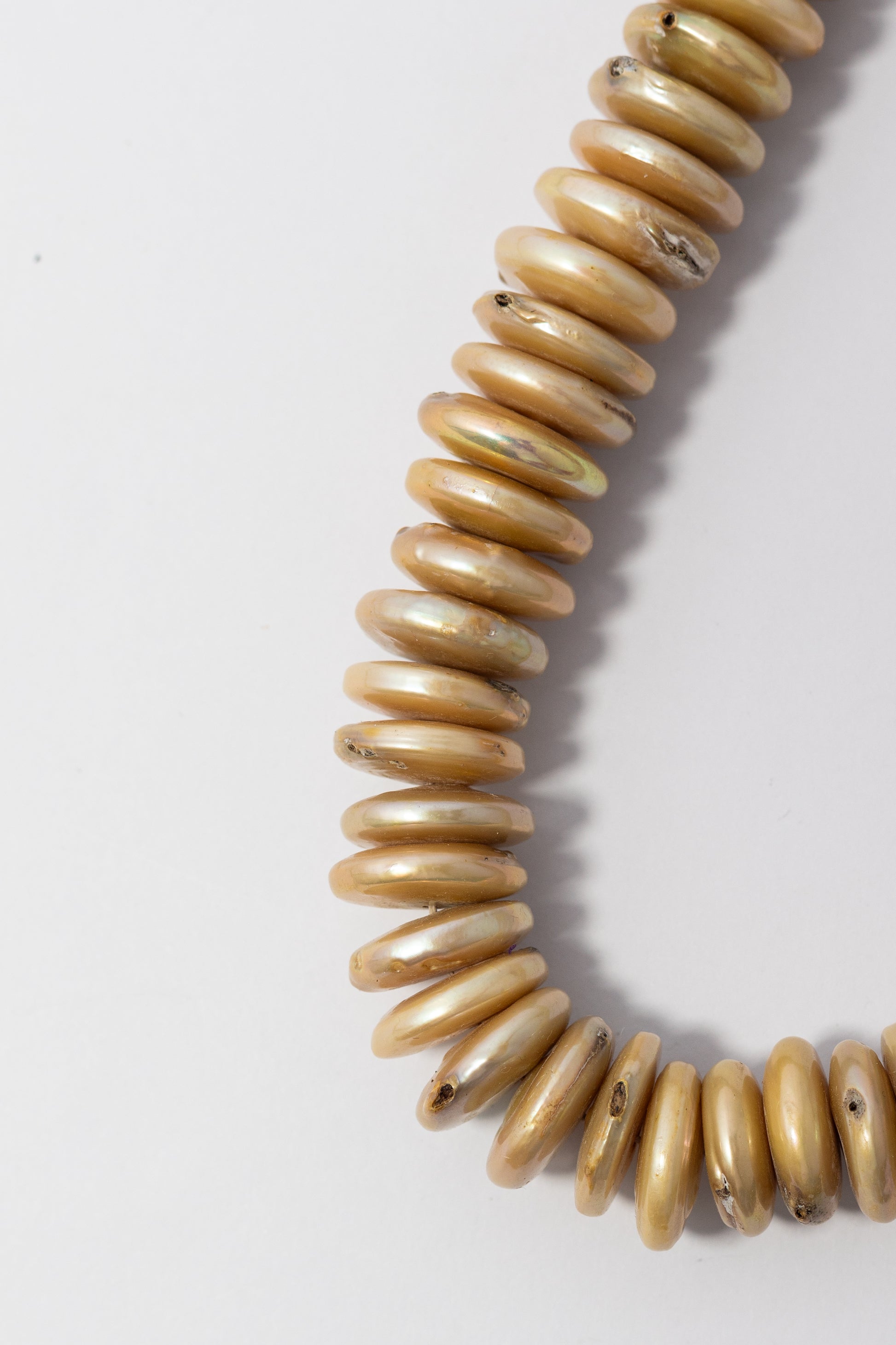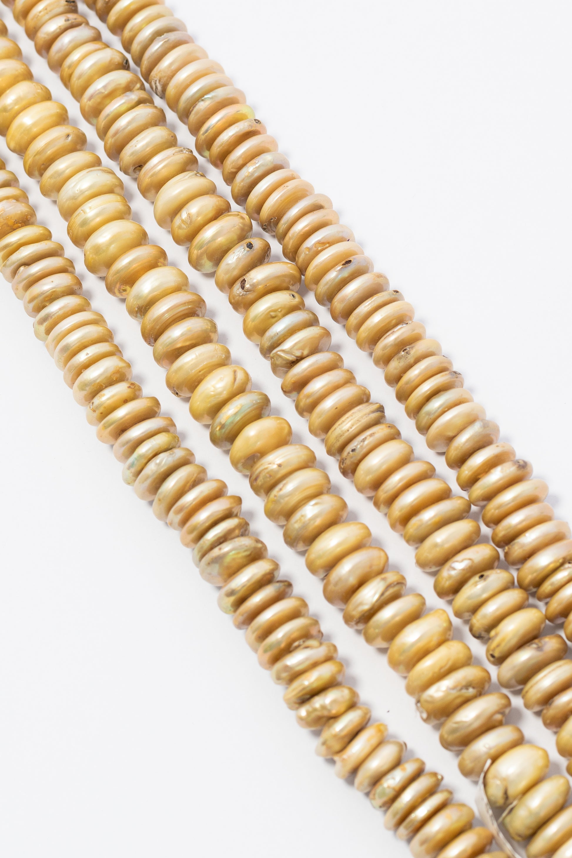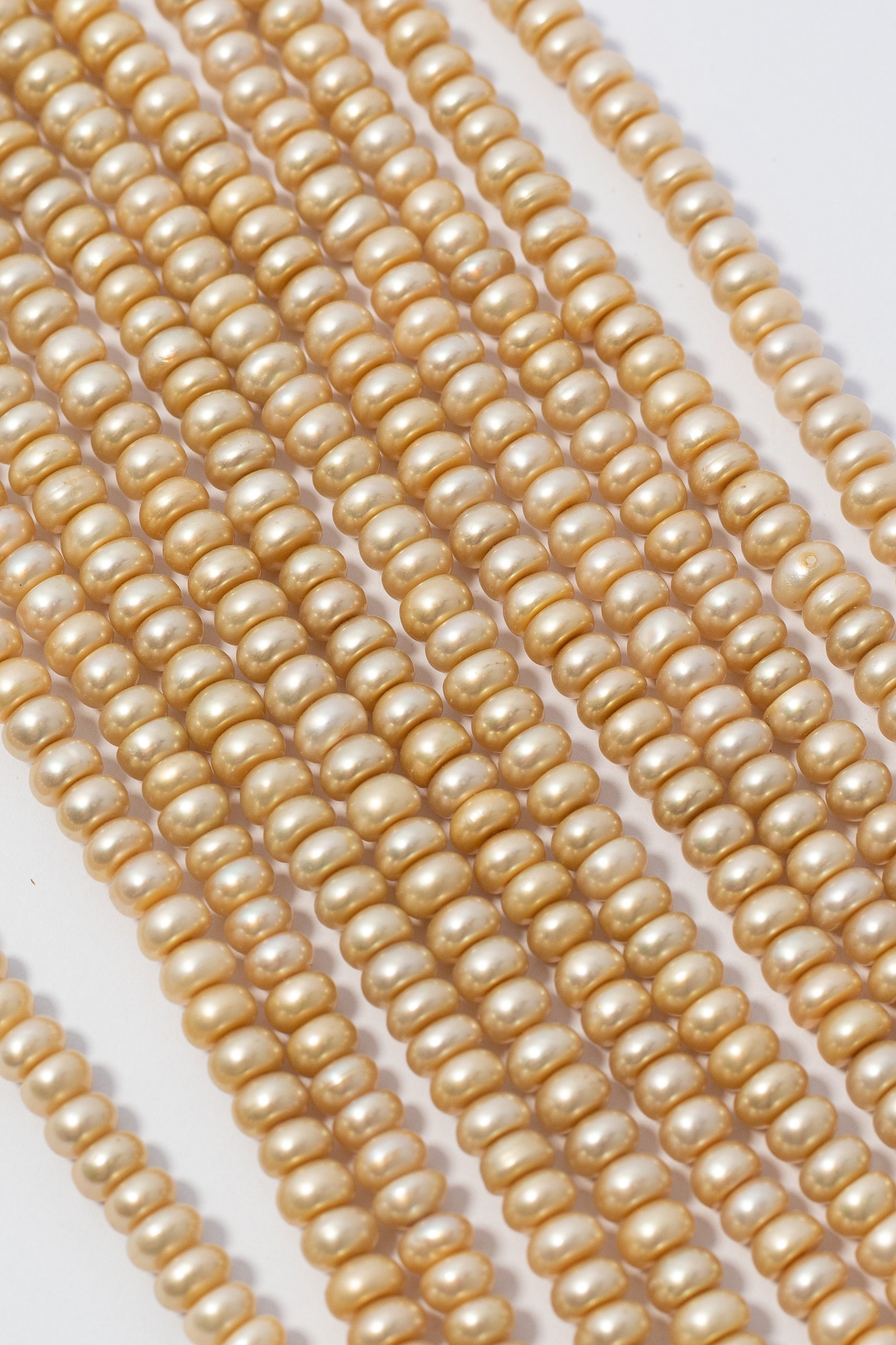 Perlas cultivadas en forma de rondelle con un elegante acabado dorado metálico. Su estructura geométrica achatada y uniforme crea un perfil moderno que contrasta con las formas esféricas tradicionales. El brillo nacarado intenso con matices irisados añade profundidad y luminosidad a cada pieza. Perfectas para crear collares densos y lujosos, brazaletes de gran impacto visual o accesorios que transmitan distinción y calidez. Un componente versátil para joyería de autor que busca presencia y elegancia.