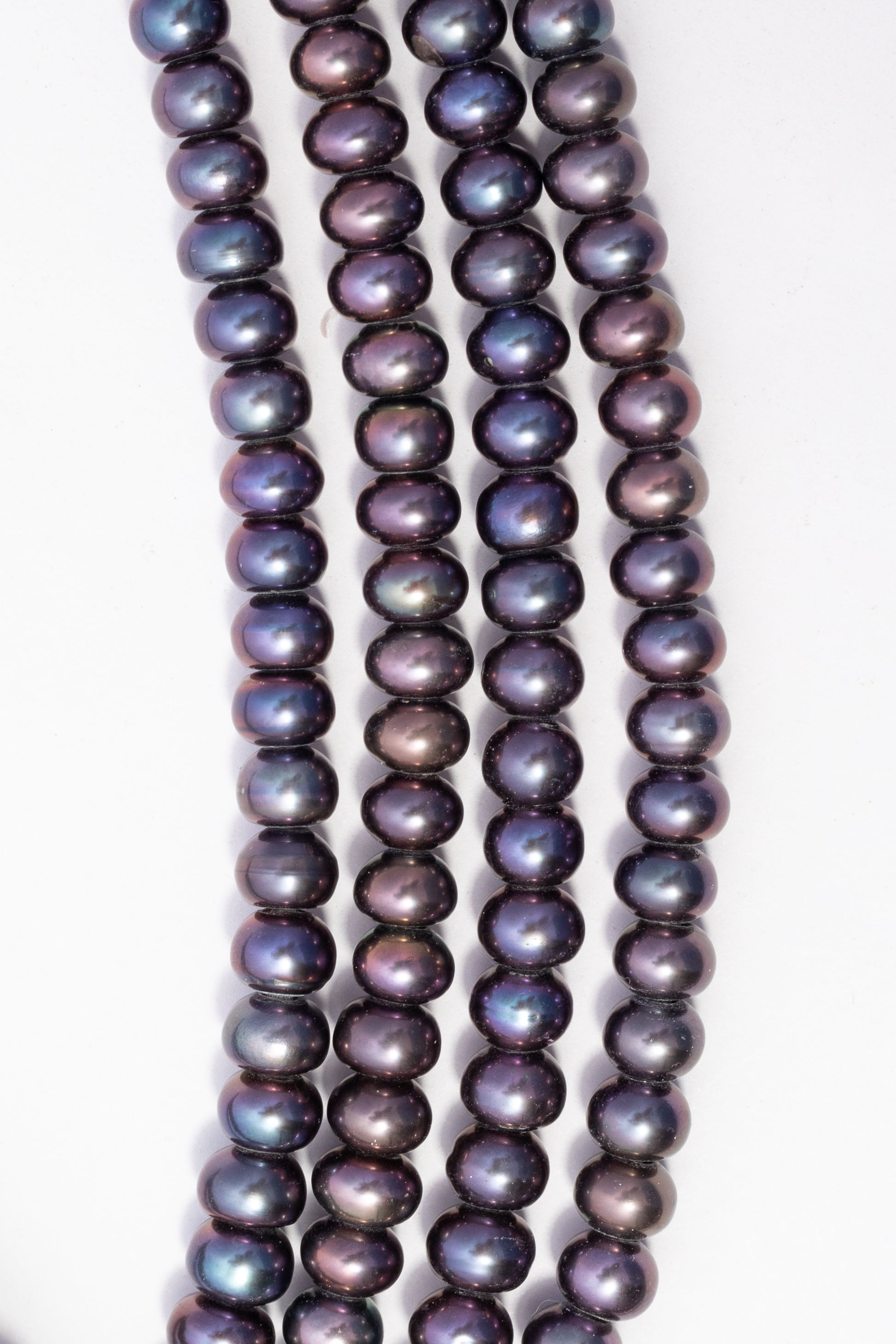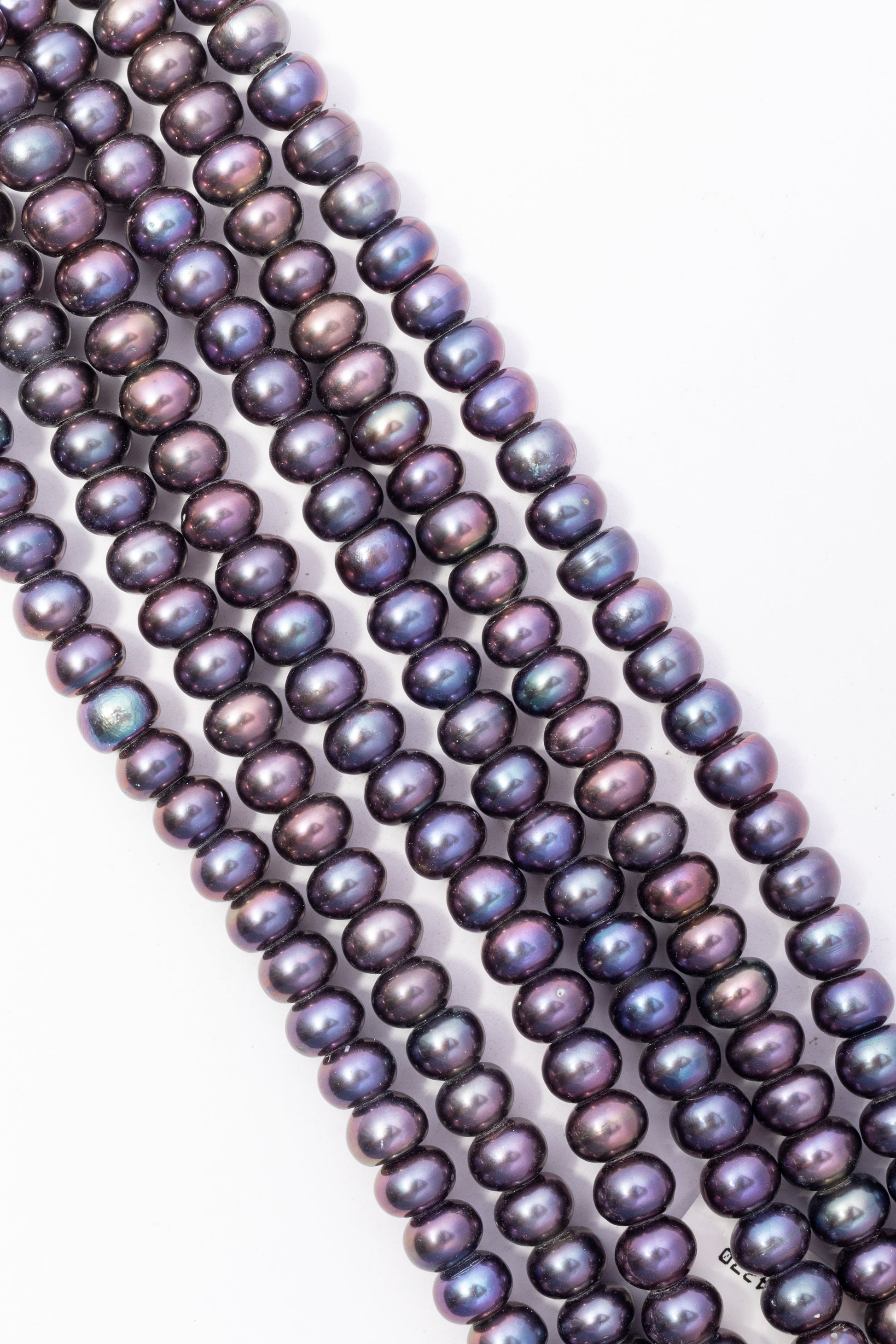 Hilo de perlas rondelle cultivadas con forma geométrica achatada y uniforme. Destaca por su brillo metálico e irisado intenso, con tonos azul petróleo, pavo real y destellos purpúreos que cambian con la luz. Su silueta compacta y acabado vibrante lo hacen perfecto para collares densos y contemporáneos, brazaletes delicados de múltiples hilos y accesorios nocturnos con elegancia sofisticada e impacto visual notable.