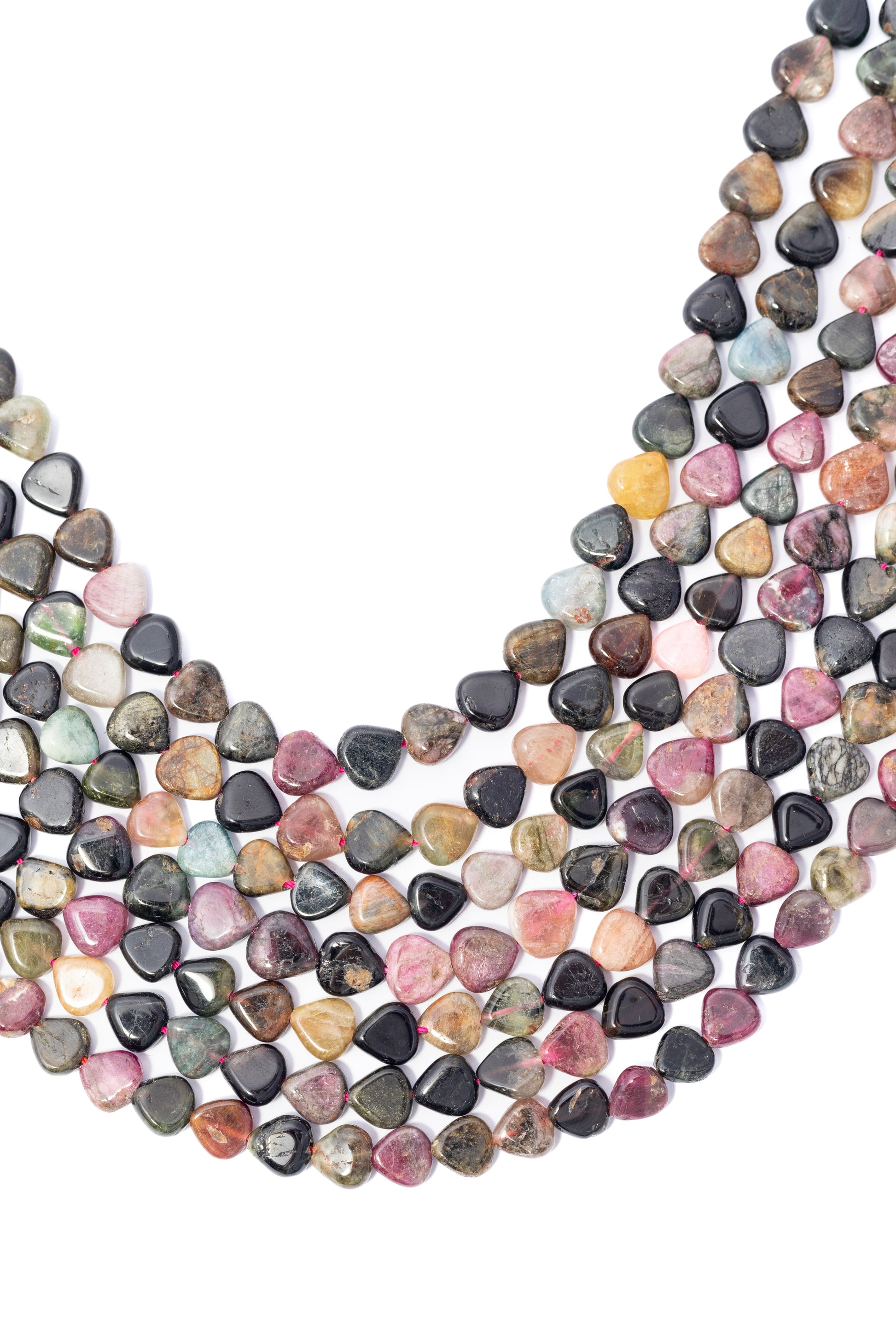 Esta tira de piezas presenta un diseño de cuentas con forma de corazón estilizado o gota invertida, caracterizada por una composición densa de m̼ltiples hilos que aportan una estructura romÁntica, sustancial y de gran riqueza orgÁnica. Su apariencia destaca por una sofisticada y profunda paleta multicolor, que combina tonalidades negro azabache, burdeos, rosa cuarzo, verde musgo y matices Ámbar, con un pulido suave que resalta las vetas naturales y la opacidad ̼nica de cada pieza. Debido a su diseño de silueta suavizada y su variada gradación tonal, es un componente excepcional para la joyería de autor, siendo ideal para confeccionar collares de gran formato con un aire étnico elegante, diseñar pulseras con un volumen distintivo, o crear accesorios que busquen un equilibrio entre la forma simbólica y la belleza natural de los materiales.